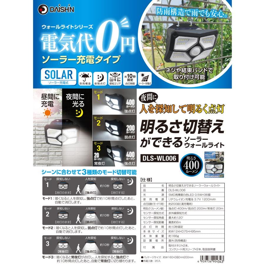 センサーライト DLS-WL006 屋外 led ソーラー ライト 人感 防水 規格 防雨 屋外 防犯 太陽光 工事不要 庭 高輝度 明るい 玄関 照明 灯 人感センサー 電灯 壁 4939736904343