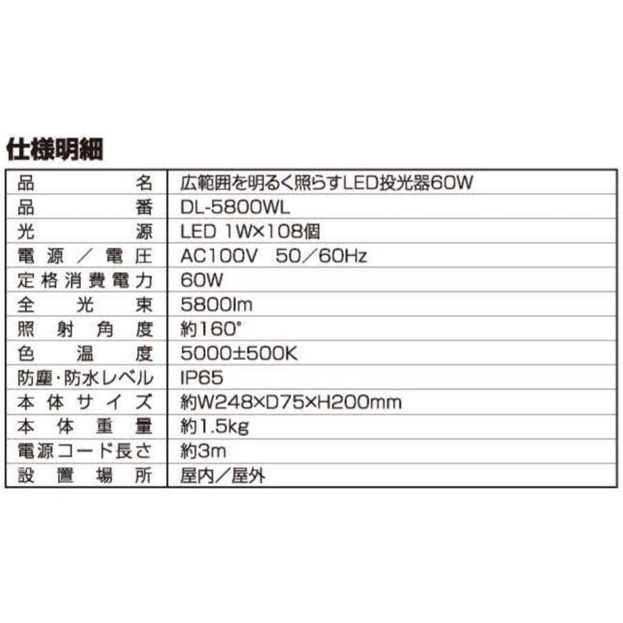 【2台セット】投光器 DL-5800WL 広範囲を照らす LED 60W 5800lm 屋外 防水 LED灯光器 ワークライト LED照明 ライト 夜間作業 コンパクト 明るい 4939736902813-2