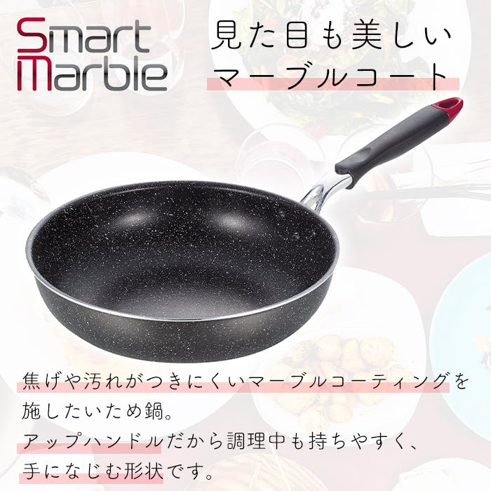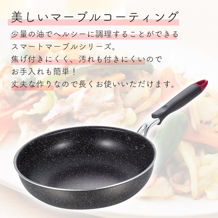 焦げつきや汚れが付きにくく、見た目も美しいマーブルコートを施した28cm炒め鍋。少量の油でヘルシーに調理ができます。ガス火はもちろん、IH調理器でも使用できます。