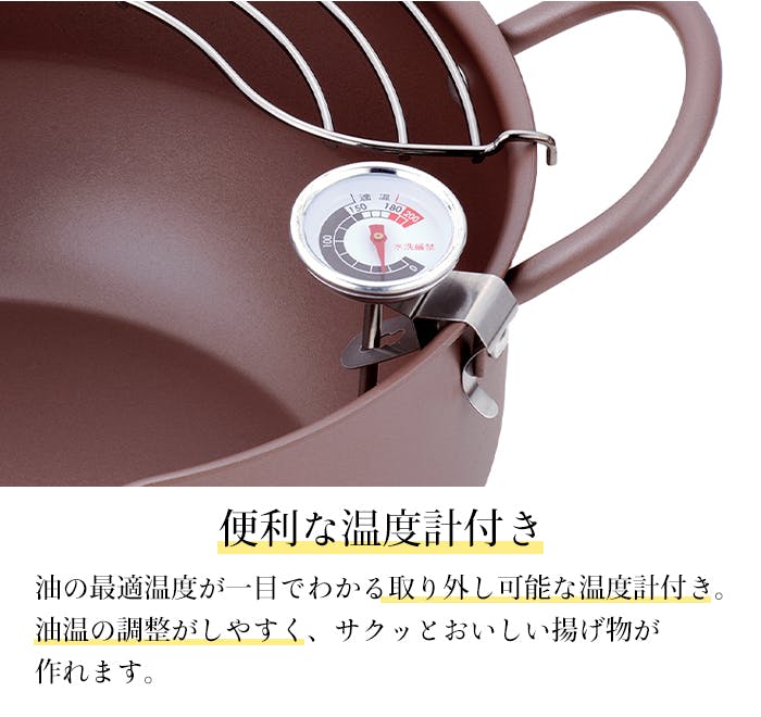 温度計付きで油温の調整がしやすい天ぷら鍋。サクッとおいしい揚げ物が作れます。便利なアミ付き。