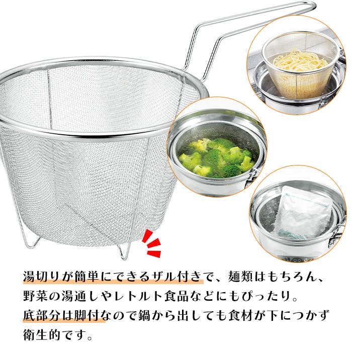 多用途に使える、ザルと目皿付きの18cm深型鍋。縁が広がっていてふきこぼれにくい安心設計です。パスタや麺類の湯切り、野菜の下茹でやレトルト食品の温めに便利なザル付き。ザルは脚付きなので、鍋から出しても食材が下につかず衛生的です。蒸し料理に使える目皿付き。調理中でも鍋の中身が見えるガラス蓋付き。