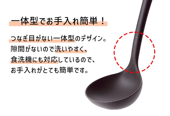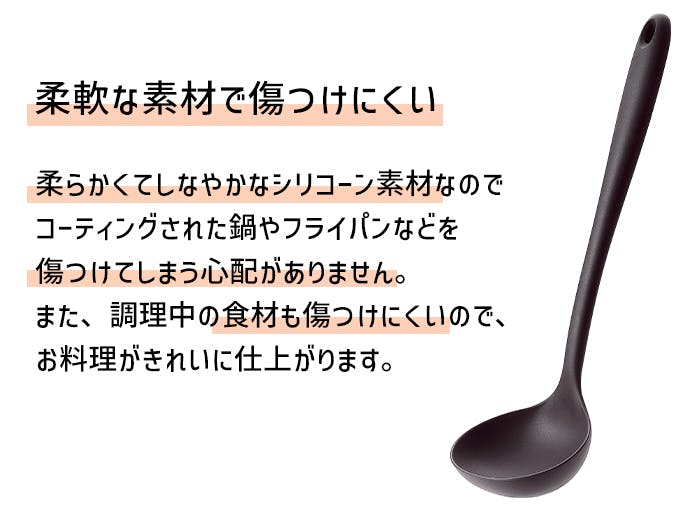 調理器具や食材をキズつけにくい、シリコーン製キッチンツール(お玉)。コーティングされた鍋やフライパンにも安心してご使用頂けます。調理中の食材もキズつけにくく、お料理がキレイに仕上がります。耐熱温度が高く、様々な調理に使えます。滑りにくく、安定して作業ができます。本体と柄につなぎ目がない一体型なので、とっても洗いやすいです。※食洗器対応