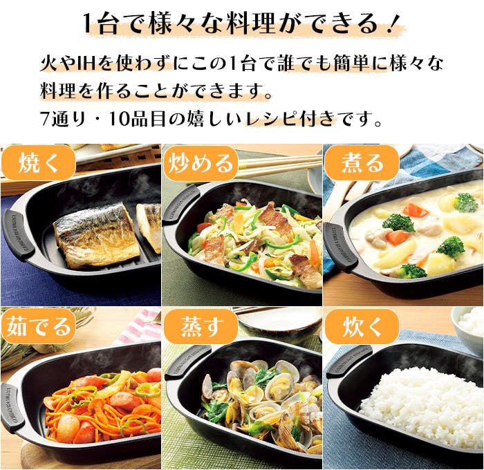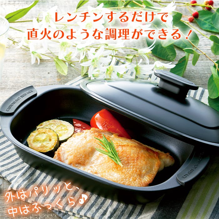 電子レンジで直火のような調理ができる、電子レンジ専用グリルパン。焼く・炒める・煮る・茹でる・蒸す・炊く・温め直しなど、様々な調理が可能。調理後はそのまま食卓へ。温かい料理が楽しめて、洗い物も減ります。本体内面はふっ素加工。汚れが落ちやすくお手入れ簡単。10品目の専用レシピ付です。