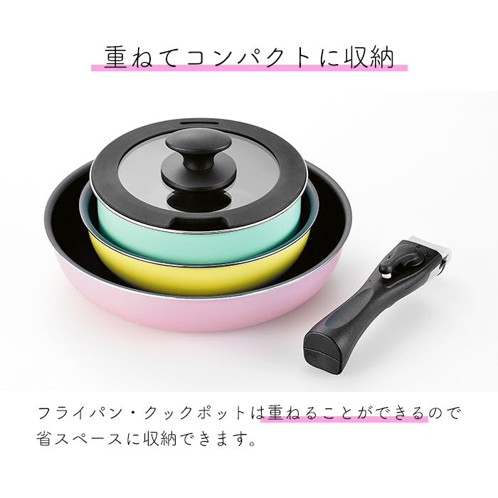 便利な脱着式ハンドルのガラス蓋付き鍋とフライパンセット。内面はフッ素樹脂加工で、お手入れが簡単。重ねてコンパクトにしまえるので、収納場所も取りません。ガス火やIH調理器はもちろん、オーブンにも利用できるので(200℃以下での使用を推奨)、料理の幅が広がります。