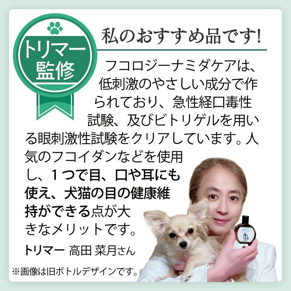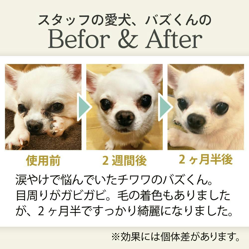 開発のきっかけは、鼻涙管閉塞により常に涙が溢れ、酷い目やにや炎症に悩む愛犬チワワの姿でした。市販の除去剤では汚れは落ちても、強い刺激に痛がる愛犬を見るのが忍びなく、「ケア後の乾燥が症状を悪化させているのでは?」という疑問を抱きました。そこで、高い保湿力を持つフコイダンに着目し「うるおう涙やけケア」をコンセプトに自社開発。低刺激で目に沁みない成分にこだわり抜いた結果、痛みを怖がっていた愛犬も今では嫌がらずにケアさせてくれます。愛犬を想う切実な気持ちから生まれた、優しさと機能性を両立した自信作です。
