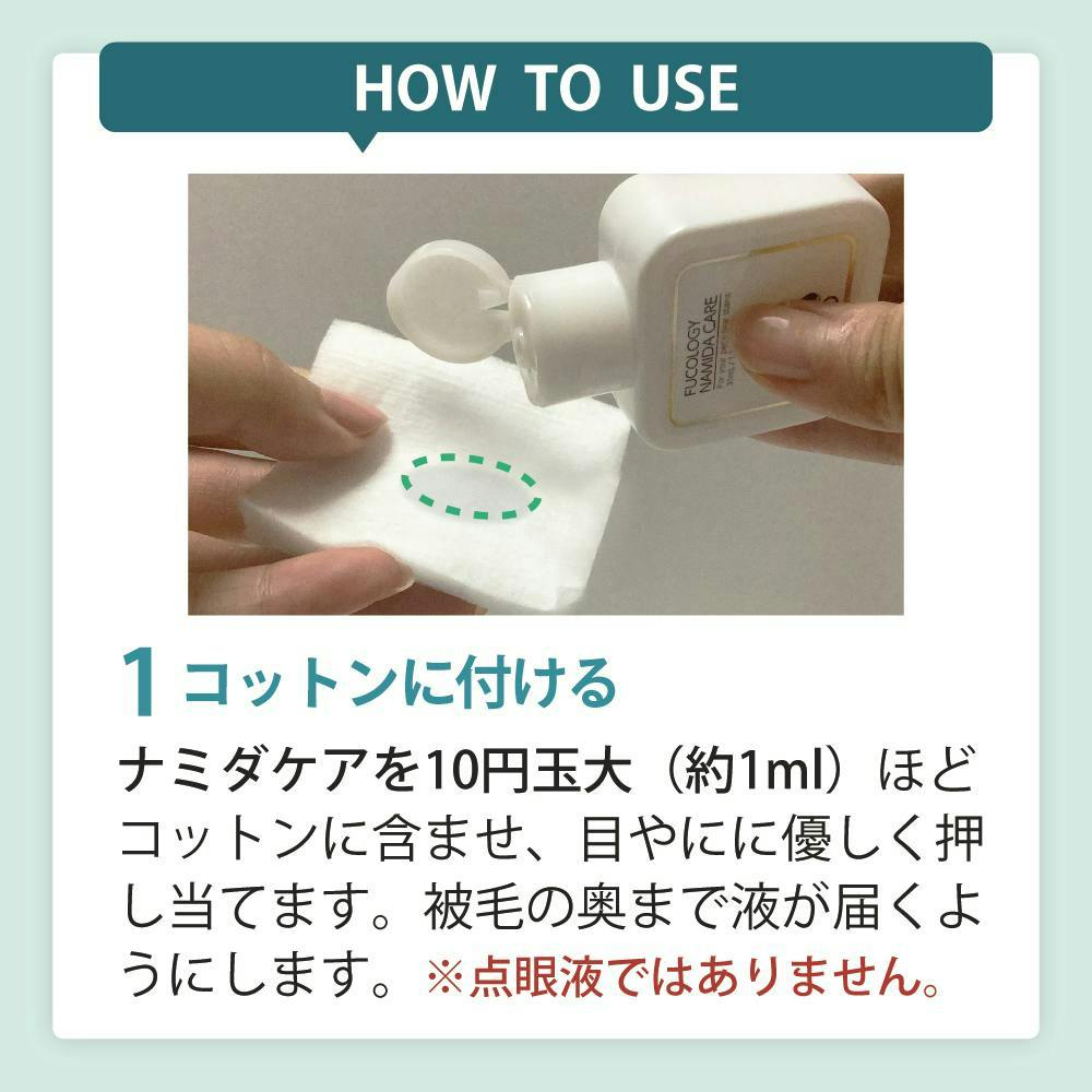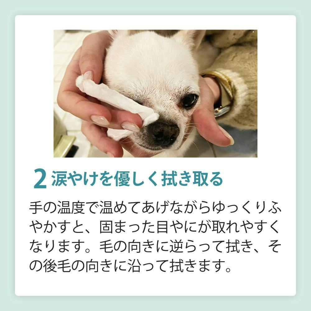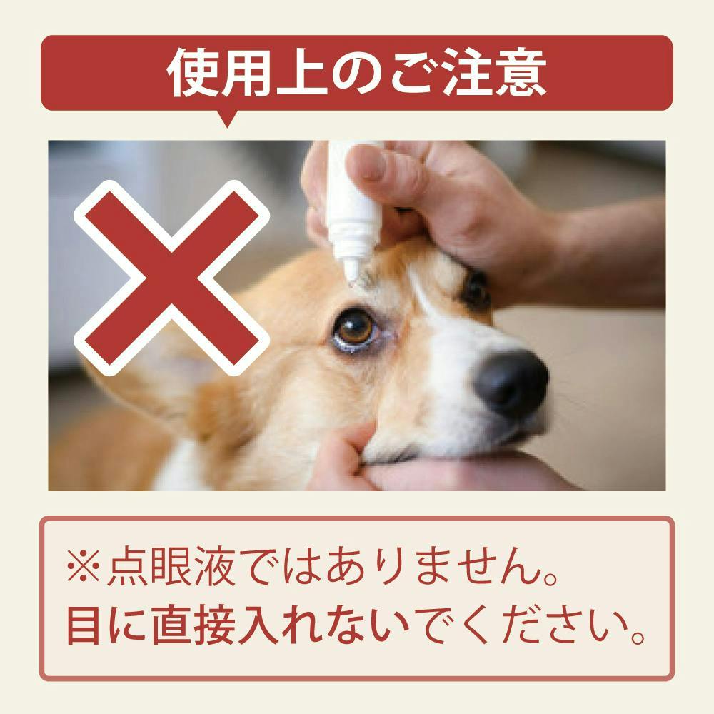 1日1回、本品をコットンに約1ml含ませ目やにに優しく押し当て拭き取ります。被毛の奥まで液が届くようにしてください。涙やけの他、ヨダレやけ・お顔まわり・耳掃除にも使用可能です。