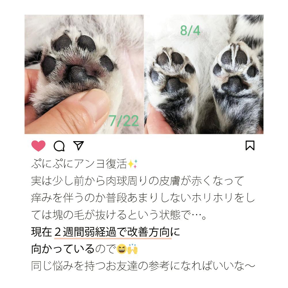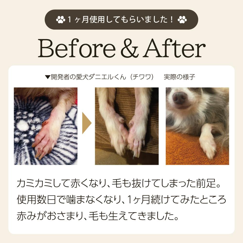 愛犬が足先を噛むようになったことをきっかけに開発。「舐めても安心」を大前提に成分を厳選し、保湿定着性を高めながらも毛玉にならない軽い使用感を実現しました。