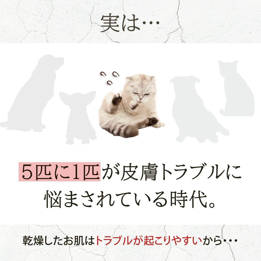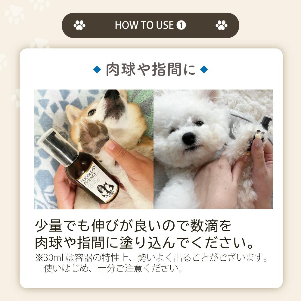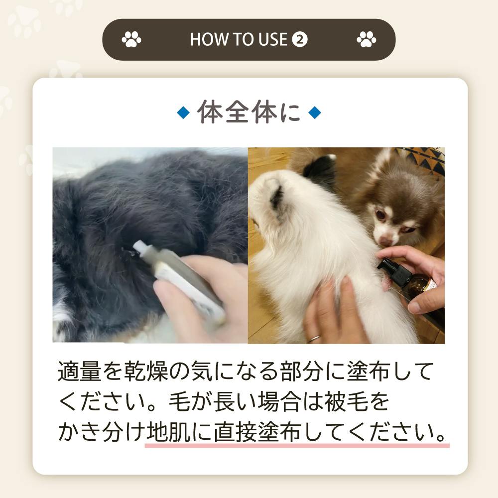 気になる部分の被毛をかき分け適量を肌になじませてください。肉球にもお使いいただけます。※傷口は避けてご使用ください。(低刺激性の成分を使用しておりますが、傷口への塗布は炎症を悪化させてしまう可能性がございます。掻き傷は必ず治してからご使用ください。)