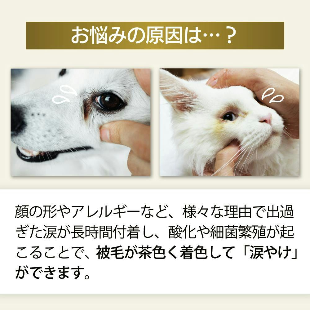 開発のきっかけは、鼻涙管閉塞により常に涙が溢れ、酷い目やにや炎症に悩む愛犬チワワの姿でした。市販の除去剤では汚れは落ちても、強い刺激に痛がる愛犬を見るのが忍びなく、「ケア後の乾燥が症状を悪化させているのでは?」という疑問を抱きました。そこで、高い保湿力を持つフコイダンに着目し「うるおう涙やけケア」をコンセプトに自社開発。低刺激で目に沁みない成分にこだわり抜いた結果、痛みを怖がっていた愛犬も今では嫌がらずにケアさせてくれます。愛犬を想う切実な気持ちから生まれた、優しさと機能性を両立した自信作です。