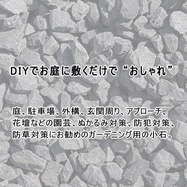 品質・形状: 天然石のため色調や濃淡にバラツキがあり、黒以外の色が混ざる場合があります。砕石機で製造しているため、形状や寸法(ふるい網目基準)には多少の個体差が生じます。使用量の目安(1平米あたり):厚さ3cm:約48kg 厚さ4cm:約64kg 厚さ5cm:約80kg 備考: 実際の使用量は敷き方や施工時の厚みによって増減するため、上記数値はあくまで目安としてご活用ください。
