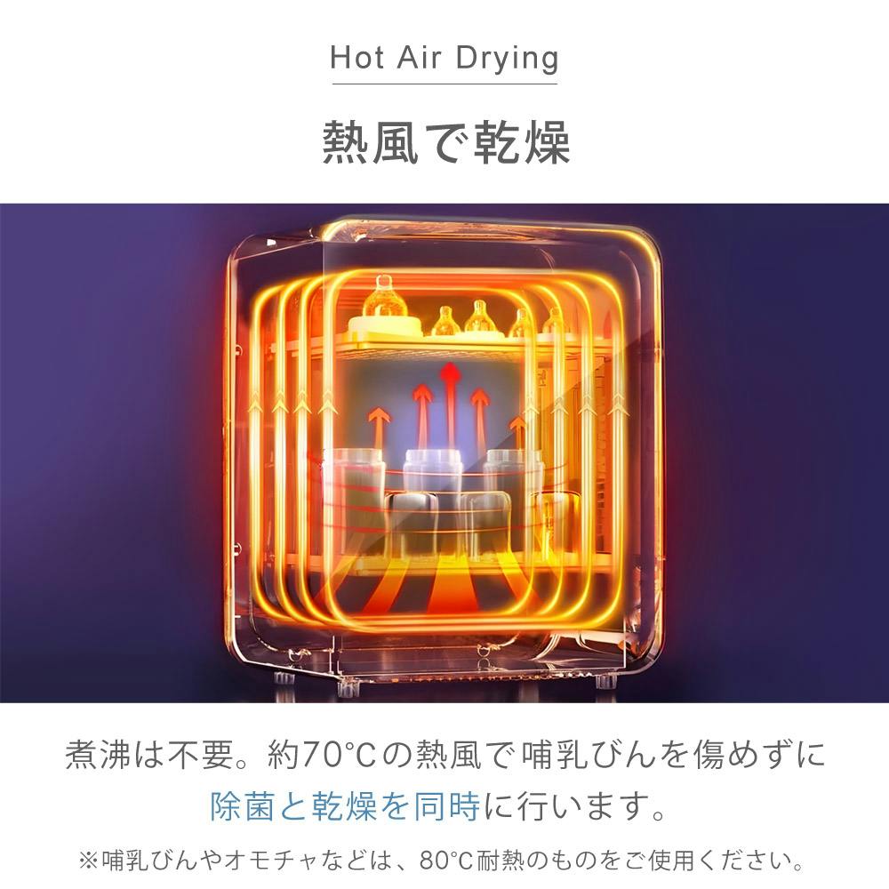 熱風で乾燥/煮沸は不要。約70℃の熱風で哺乳びんを傷めずに除菌と乾燥を同時に行います。※哺乳びんやオモチャなどは、80℃耐熱のものをご使用ください。