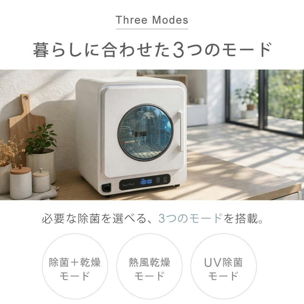 【除菌+乾燥】熱風乾燥とUV除菌で、清潔&しっかり乾燥。【熱風乾燥】短時間でカラッと乾燥。急いでいる朝にも◎【UV除菌】UV除菌と送風乾燥で熱に弱いものもやさしく除菌・乾燥。