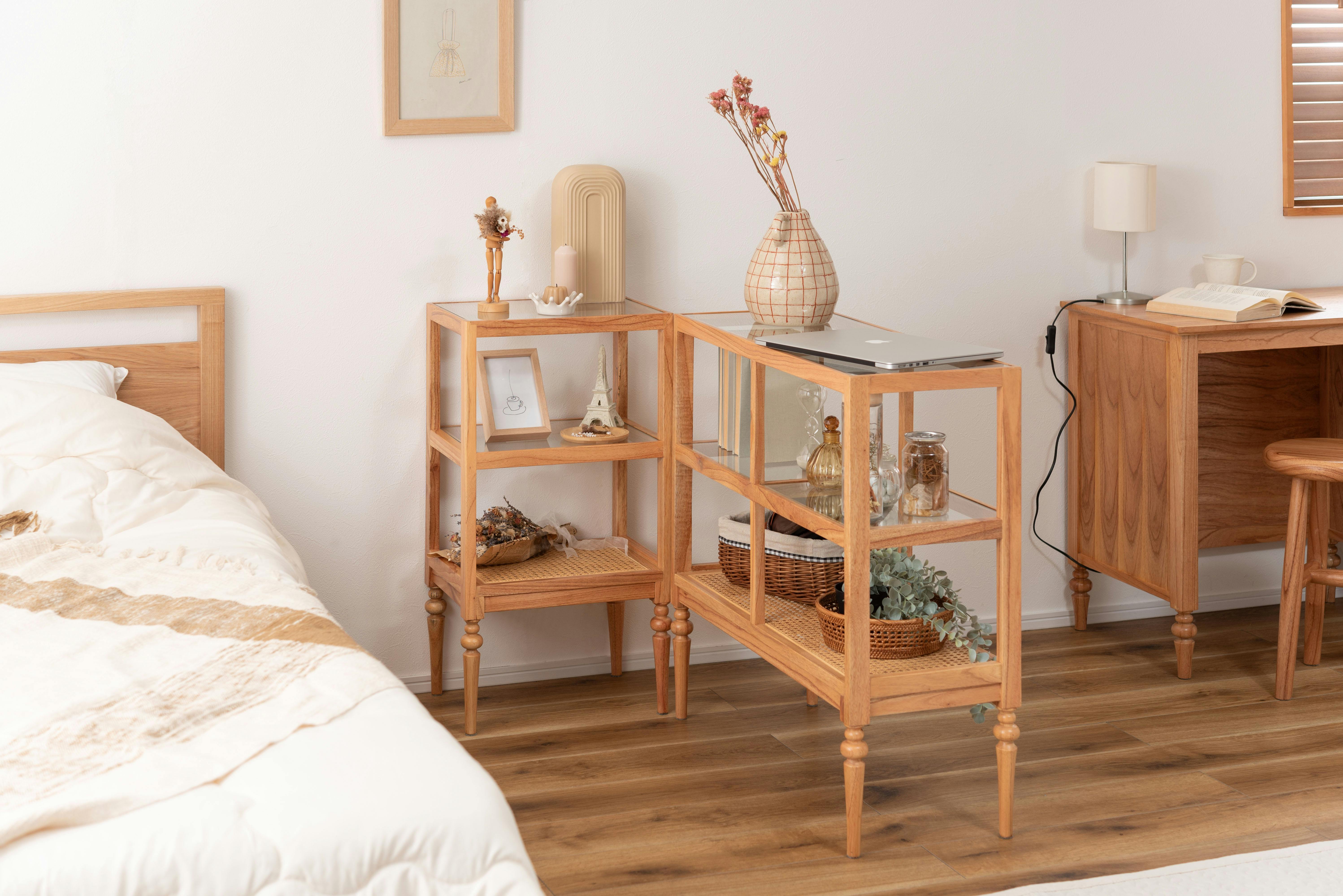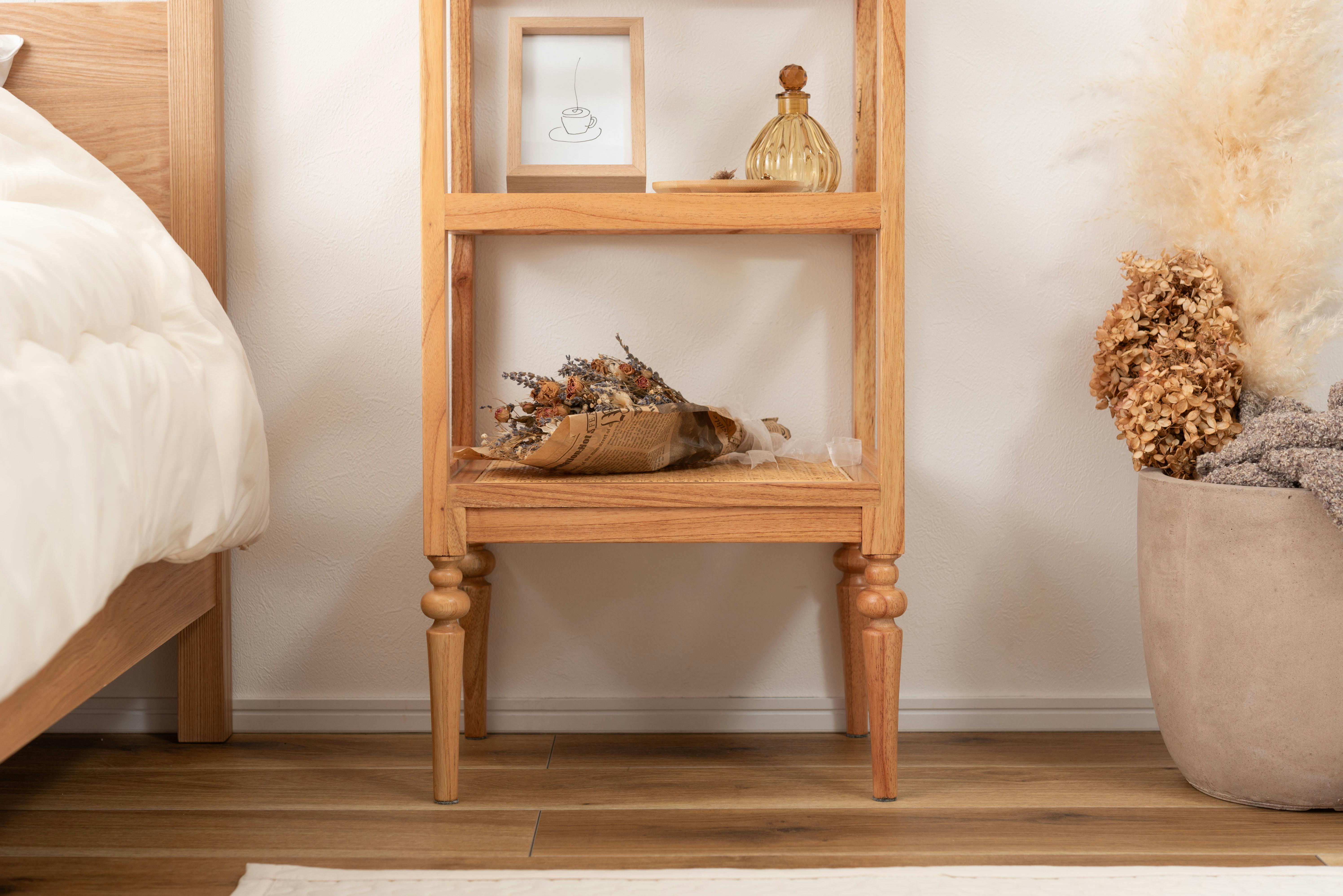 ナチュラル×クラシカルな雰囲気を演出天然木とラタンを使用したナチュラルなイメージのデザインながら、ターンドレッグ(ろくろ脚)を採用することで、クラシカルな雰囲気も感じられるオープンシェルフ&サイドテーブル。ガラス天板で抜け感もあり、使いやすいサイズ感も魅力です。