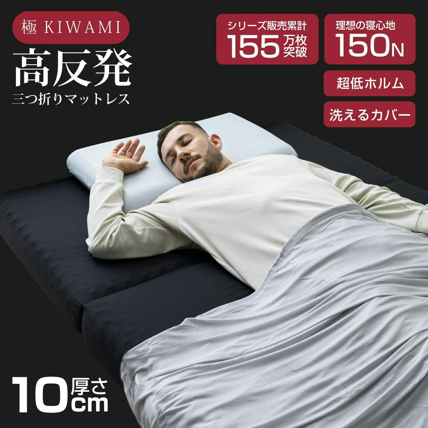 【極】高反発マットレスは、硬すぎず柔らかすぎない絶妙な硬さで、どんな寝姿勢にもフィットします。極厚10cmのウレタン素材が、体をしっかりと支えながらも、ふんわりとした寝心地を実現。三つ折り式で収納も簡単で、使わない時はコンパクトに折りたためるため、スペースを有効活用できます。
