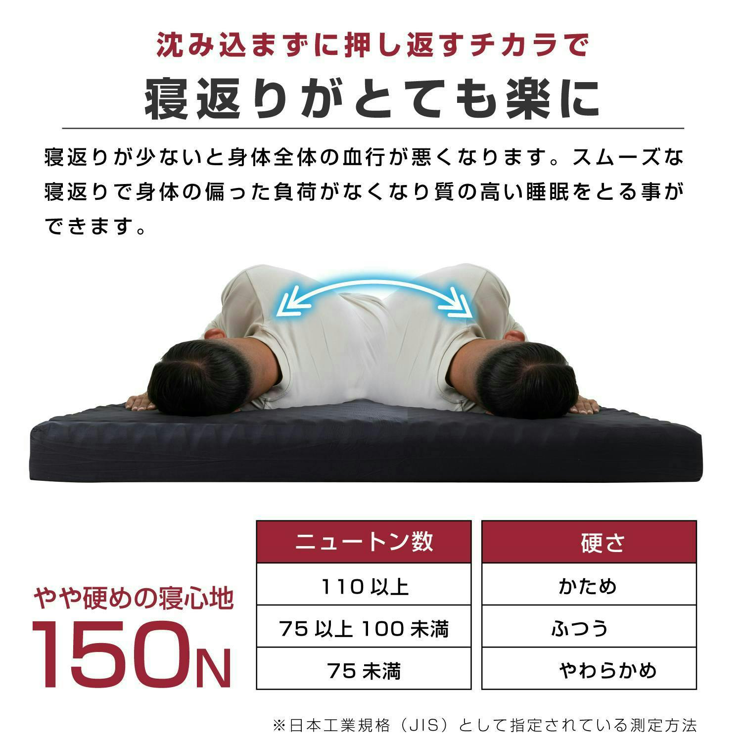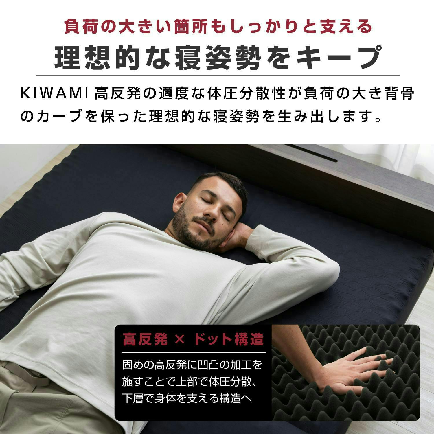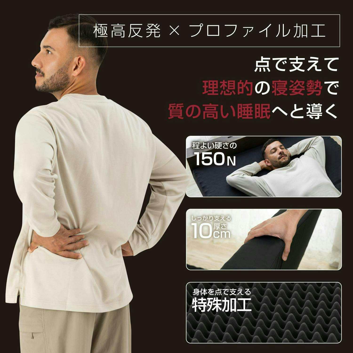 【極】高反発マットレスは、体を点でしっかり支える構造により、腰や背中など負担のかかりやすい部分をサポートします。適度な弾力と150Nの高反発の安定感で、理想的な寝姿勢をキープ。背骨の自然なS字カーブを保ちながら、肩や腰への圧力を分散します。硬すぎず柔らかすぎない理想的な寝心地で、長時間の睡眠でも身体が痛くなりにくく、翌朝のスッキリ感を実感できます。