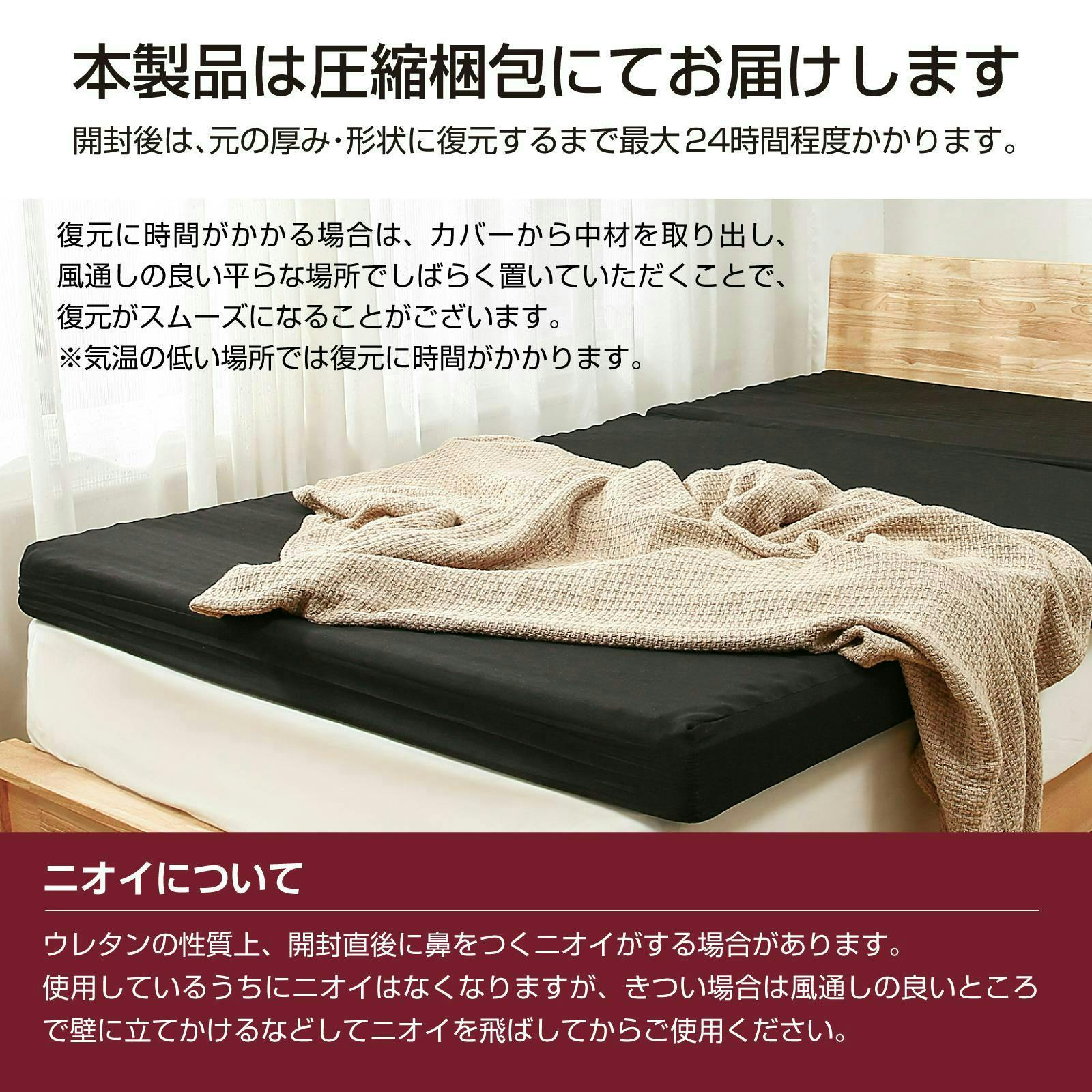 商品を開封してから復元するまで最大24時間かかります。開封後、マットレスが元の形に復元しにくい場合は、カバーから中材を取り出して放置していただきますと復元時間が短縮される場合がございます。