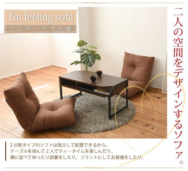 2つに分割できて便利!座椅子としても、シンプルなフロアソファとしても活躍できます。それぞれの背もたれに7段階調整可能な日本メーカー製ギアを使用。フルフラット可能なので、ごろ寝にもオススメです。また、生地は撥水加工を施しているので、日常で安心してお使いいただけます。程よい弾力の中材がしっかりと身体を支え、快適な座り心地となっています。