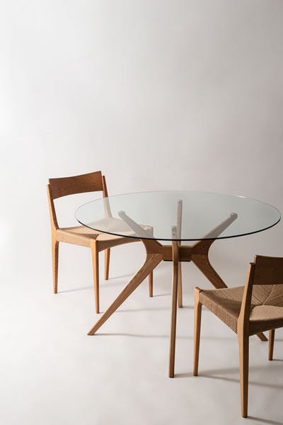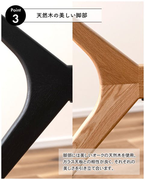 ●視界を遮ることなく空間をすっきりと見せてくれます。●円形天板なので、どの場所でも自由に座れます。●小さなお子様の食事のサポートや団らんにぴったりな形状。●脚部には美しいオークの天然木を使用。●ガラス天板はオーク材との相性も良く、それぞれの美しさを引き立てます。