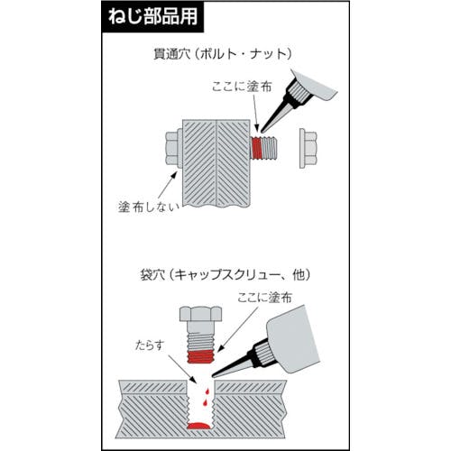 低強度取りはずし可能(ねじ用)M12以下のロックとシールに適します。耐振動・耐衝撃性良好で取り外しも容易に行えます。