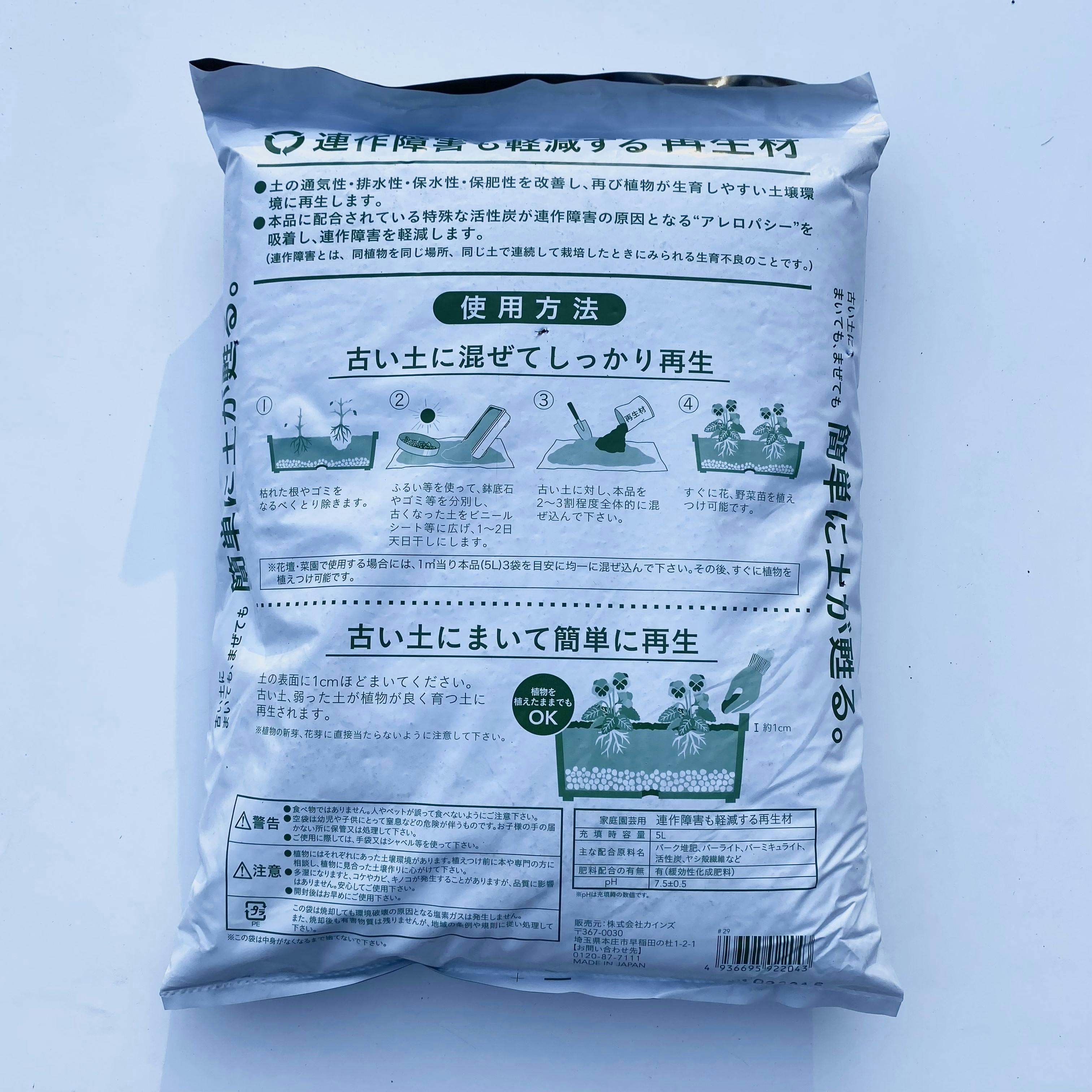 土の通気性・排水性・保水性・保肥性を改善し、再び植物が生育しやすい土壌環境に再生します。本品に配合されている特殊な活性炭が連作障害の原因となるアレロパシーを吸着し、連作障害を軽減します。