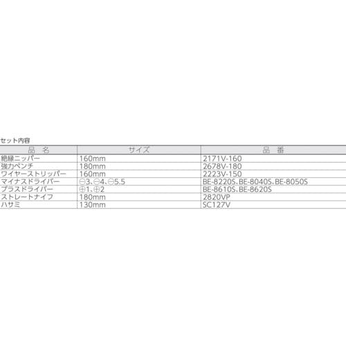 絶縁ニッパー160mm、強力ペンチ180mm、ワイヤーストリッパー160mm、マイナスドライバー3本([[-]]3、4、5.5)、プラスドライバー2本([[+]]1、2)、ストレートナイフ180mm、ハサミ130mm、特製レザーケース