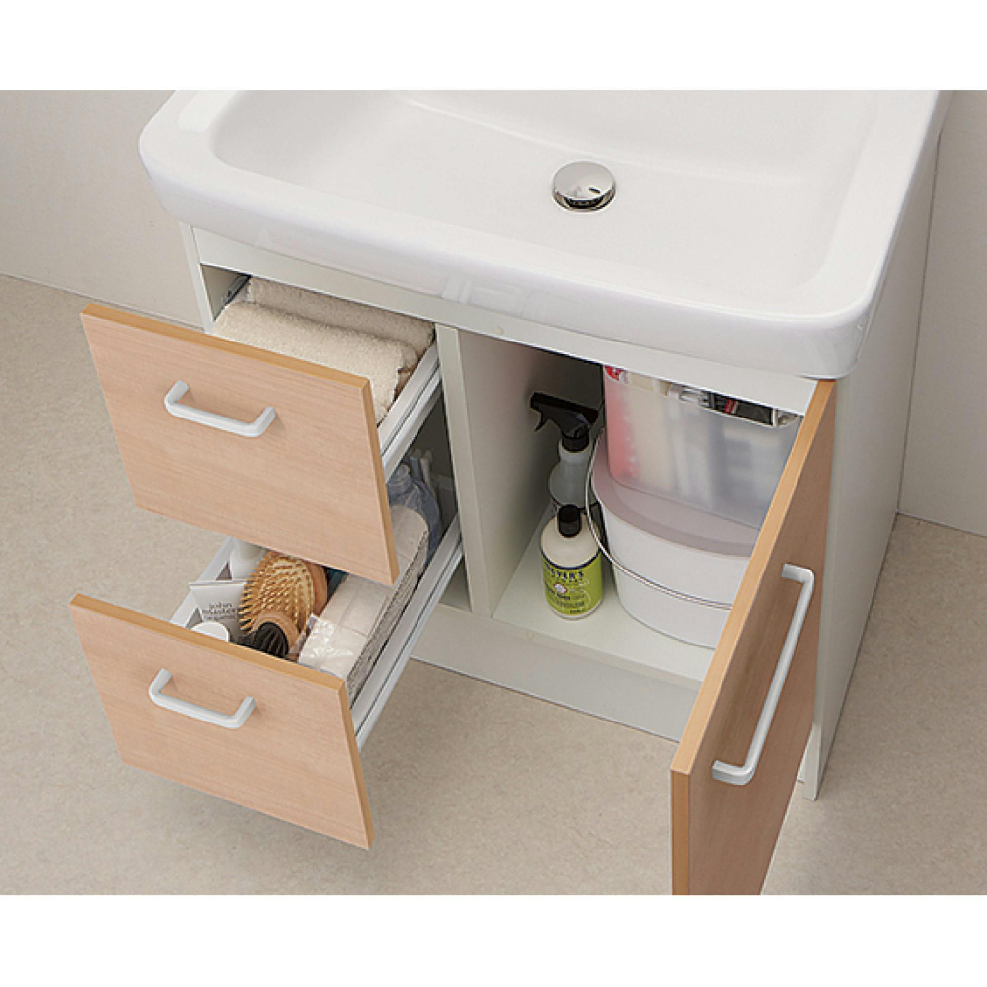 ●カラー:ホワイト ●片引出タイプ ●シングルレバー洗髪シャワー水栓/ホース収納式/リフトアップ付/整流吐水切り替え付/エコハンドル ●ボウル材質:陶器 ●洗面器容量:15L ●陶器製大型洗面器 ●スロープ形状:水のたまりにくい蛇口まわりのスロープ ●らくとれヘアキャッチャー:髪の毛がからまず、するっととれるヘアキャッチャー●3面鏡全収納:扉裏全収納タイプ●くもり止めコート:消費電力ゼロでくもらない鏡 ●LED電球 40W形×2灯(8.4W) ●コンセント:1個