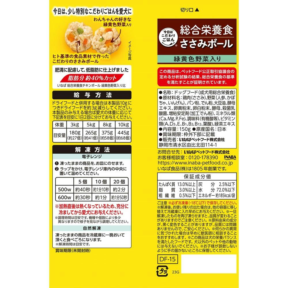(冷凍)いなば 今日はこだわりごはん 総合栄養食 ささみボール 緑黄色野菜入り 肥満に配慮低脂肪 150g【6個入り】 国産 DF-15B 4901133485541【別送品】