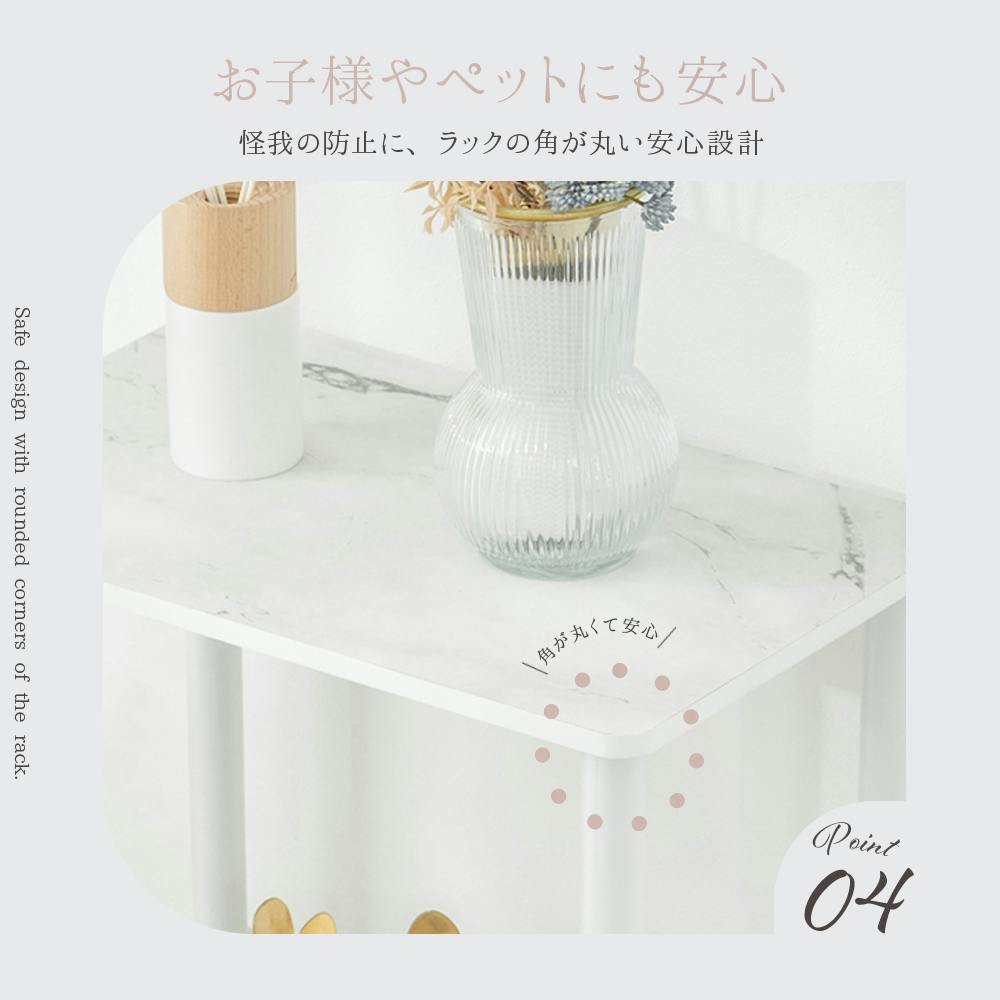 使いやすいシンプル設計なのでどんなお部屋にも合わせやすい。オープンラックで圧迫感もなく、出し入れもスムーズ。天板の角は丸みのあるデザインのため触れても痛くありません。