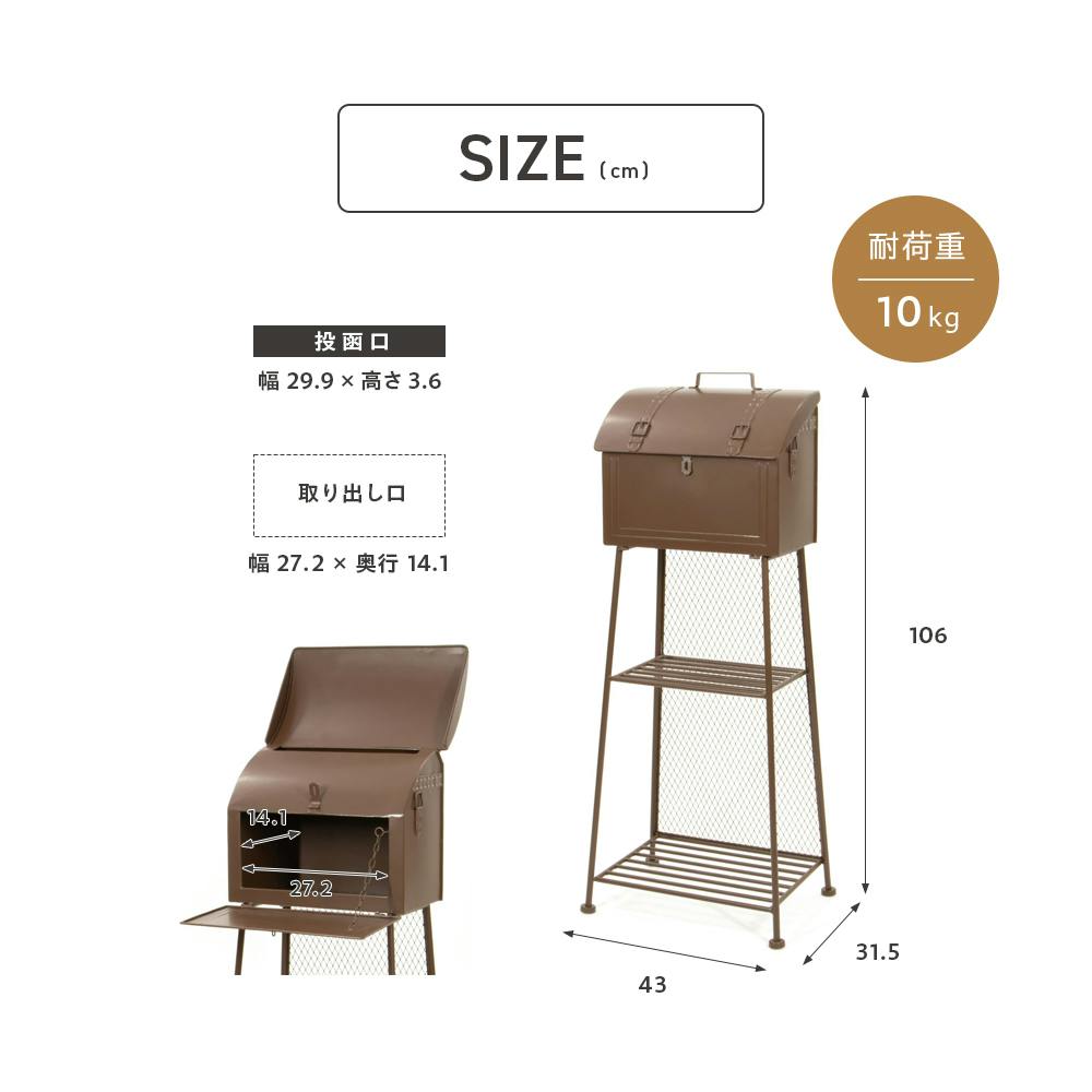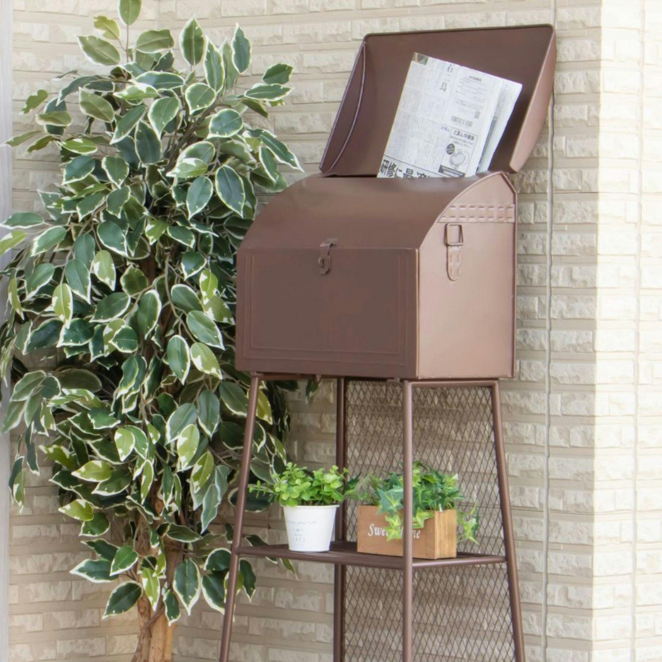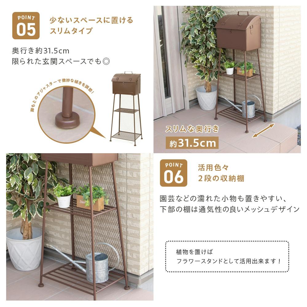 投函口はワイドなサイズ設定なので、レターパックやA4サイズも入れやすい◎脚元はアジャスターが付いているので、ガタつき防止になり安心です。下段の棚は、長靴やホースなどガーデニング小物を置ける収納棚としてお使いいただけます。