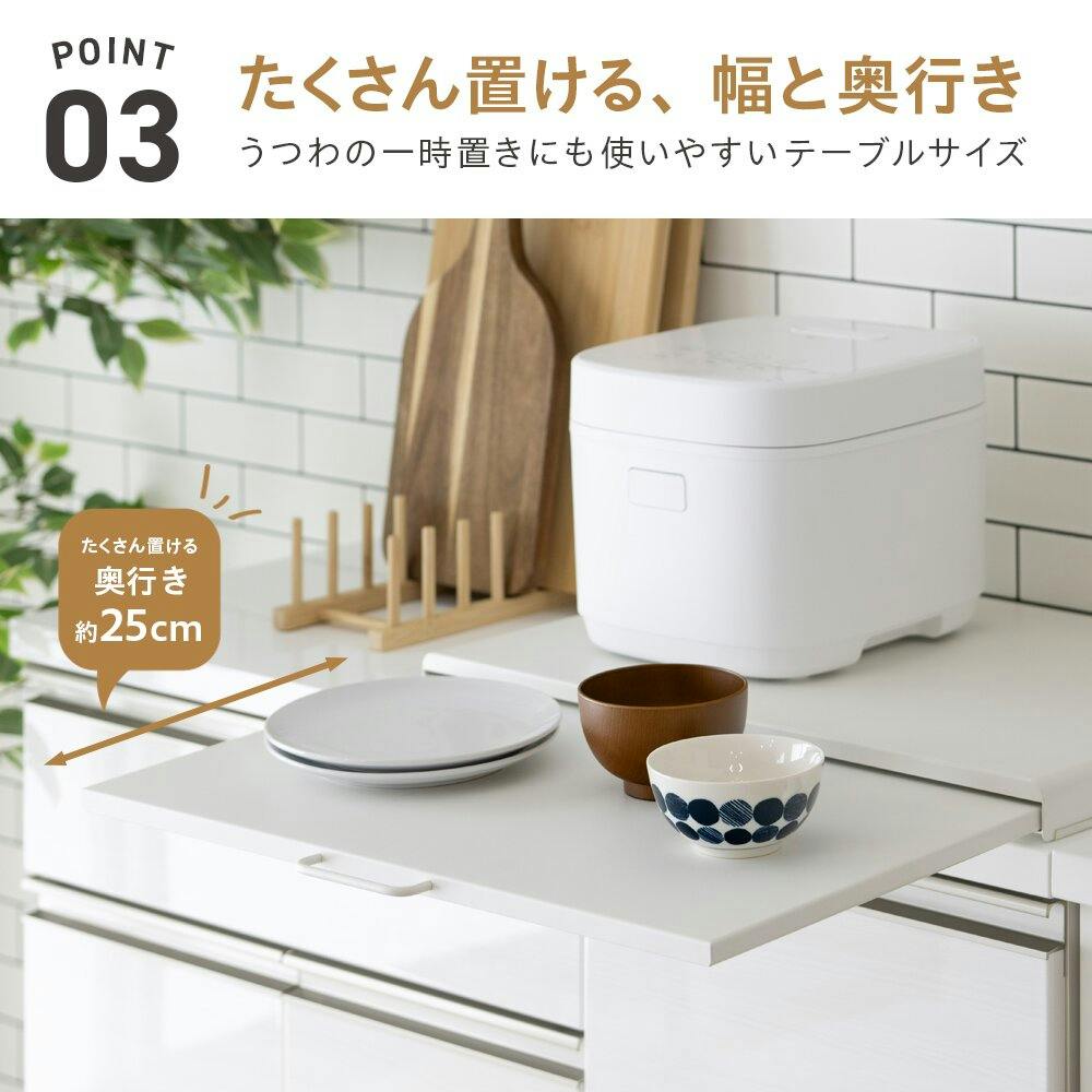 取っ手付きで引き出しも簡単!トレーは耐荷重3kgで調理中のちょっとした小物置きなどにもおすすめ