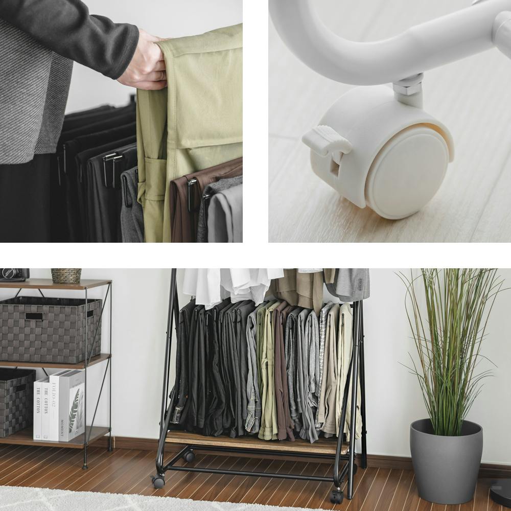 掛けた衣類が落ちるのを防ぐすべり止め付き。ストッパー付きキャスターで移動も固定もラクラク♪