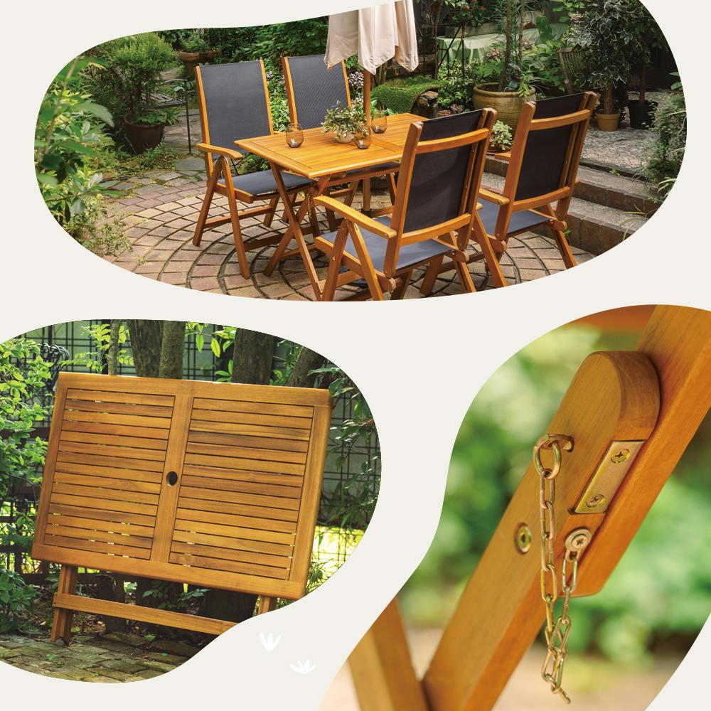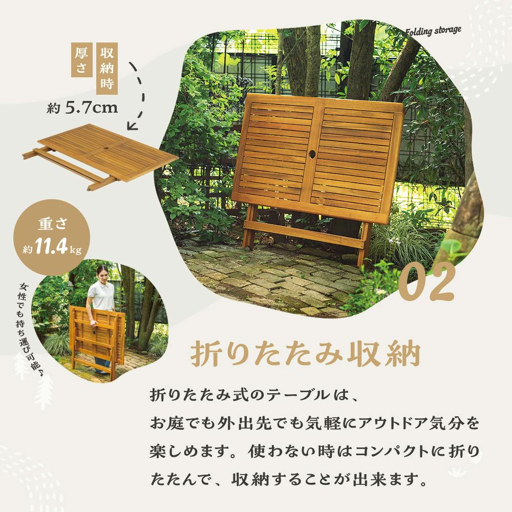 丈夫で硬く、耐朽性や耐腐食性に優れたアカシアを使用したテーブルです。使わないときは折りたたんでコンパクトに収納できます。
