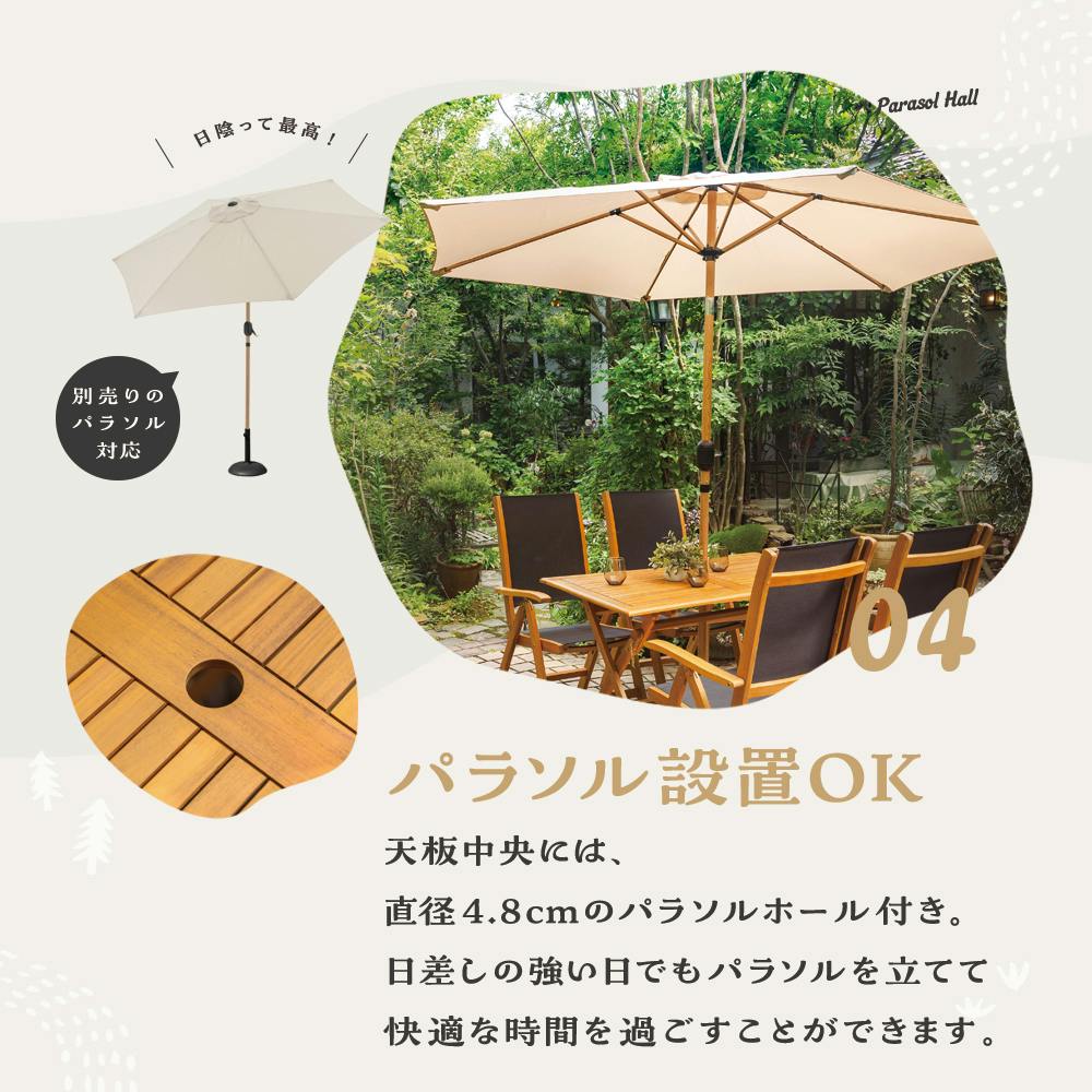 ・耐荷重/30kg・パラソルホール/Φ4.8cm・すべりにくく傾斜やガタツキのない、平坦で安定した場所に設置してください。・柔らかい地面でご使用になると、脚が地面にめり込み本体破損の原因となります。・雨天時や直接水のかかる場所、火気のそばや高温多湿になる場所では使用しないでください。変色やサビなどの原因になります。