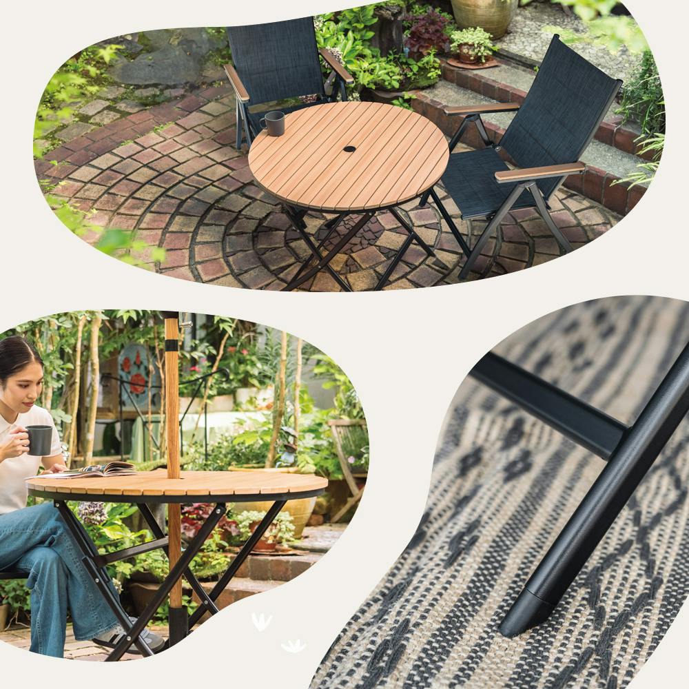耐久性が高く雨や水に強いポリスチレン素材を天板に使用。濡れても拭くだけでお手入れが簡単です。