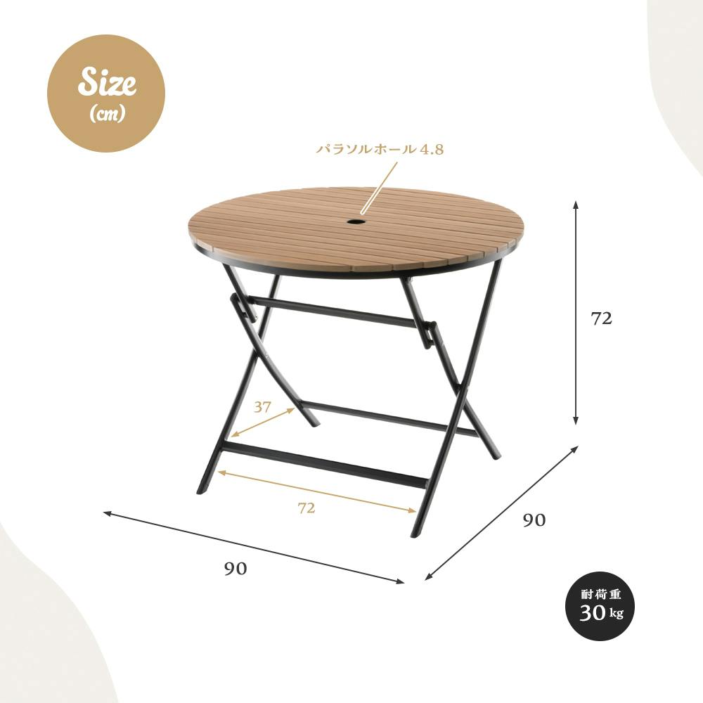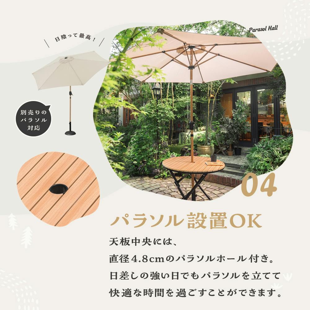 ・耐荷重/30kg・パラソルホール/Φ4.8cm・すべりにくく傾斜やガタツキのない、平坦で安定した場所に設置してください。・雨天時や直接水のかかる場所、火気のそばや高温多湿になる場所では使用しないでください。変色やサビなどの原因になります。