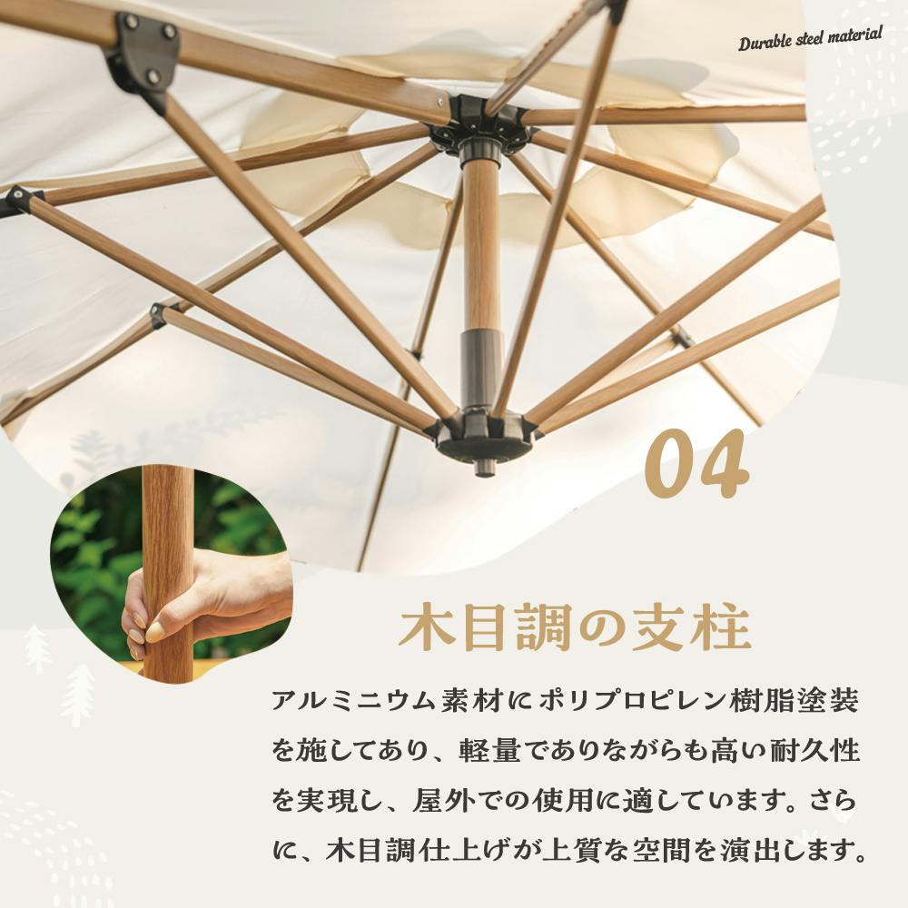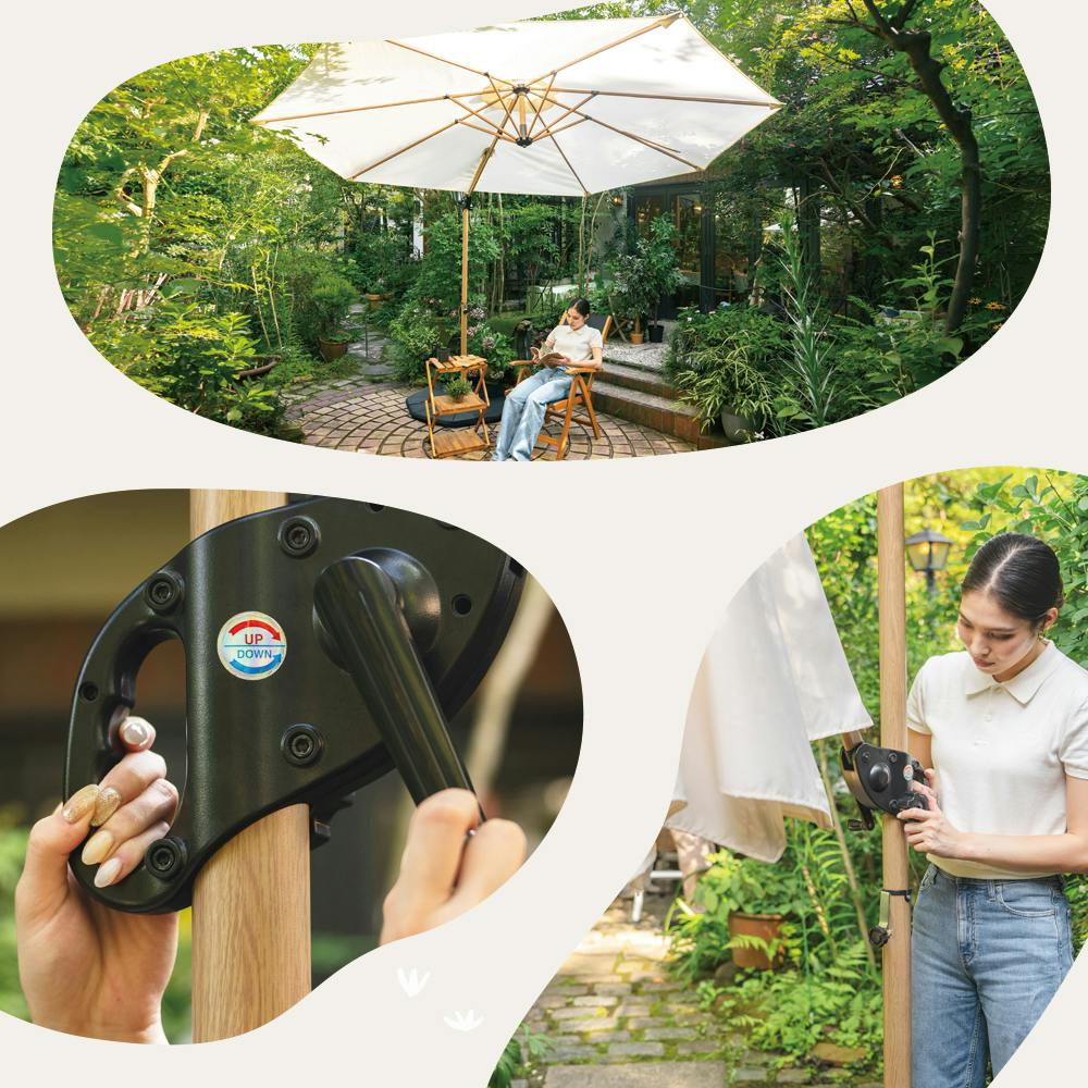 広々とした日陰空間を作れる、ワイドサイズのパラソルです。お庭やアウトドア、カフェテラスなど様々な場面で活躍します。