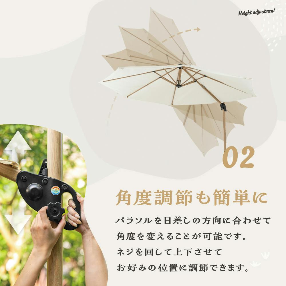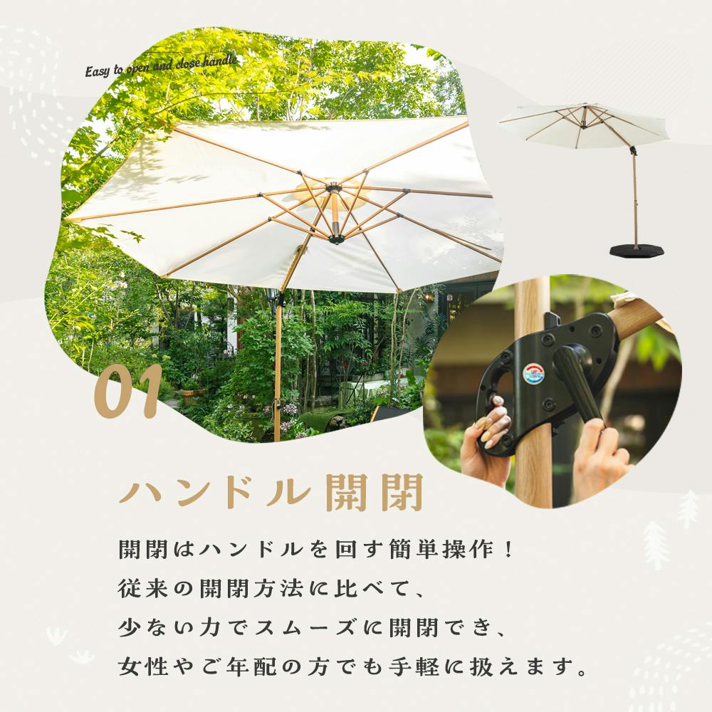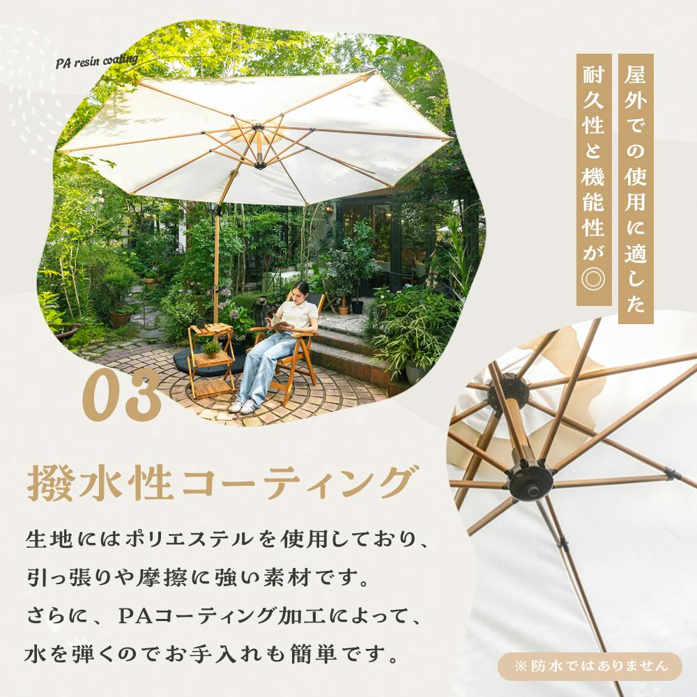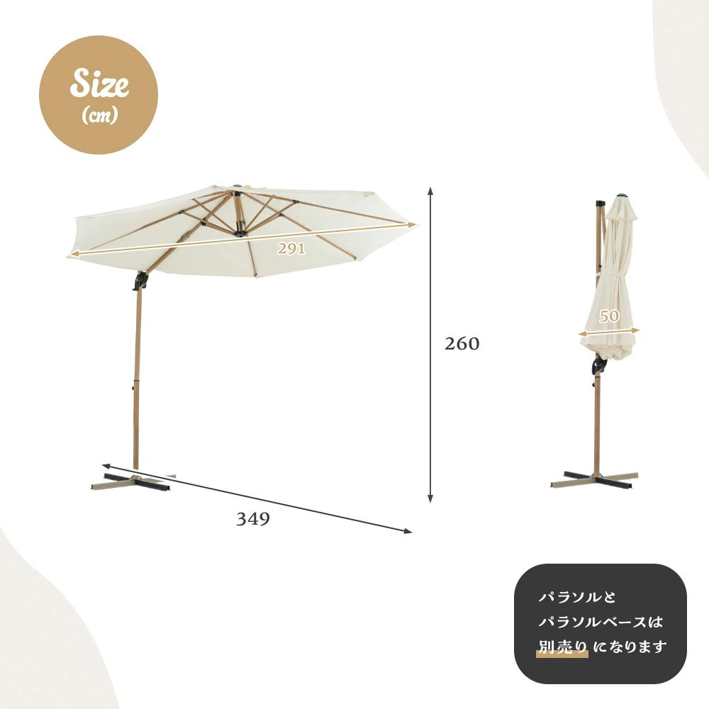 ・親骨の長さ/146cm・安全性を高めるために必ずハンギングパラソル用のベース(別売)を使用してください。・雨天や強風時・夜間はパラソルを必ず閉じて、パラソル部を安全な場所に移動させてください。・雨をよける用途には使用できません。