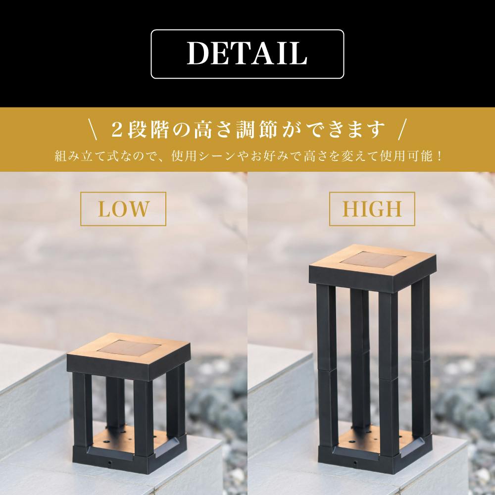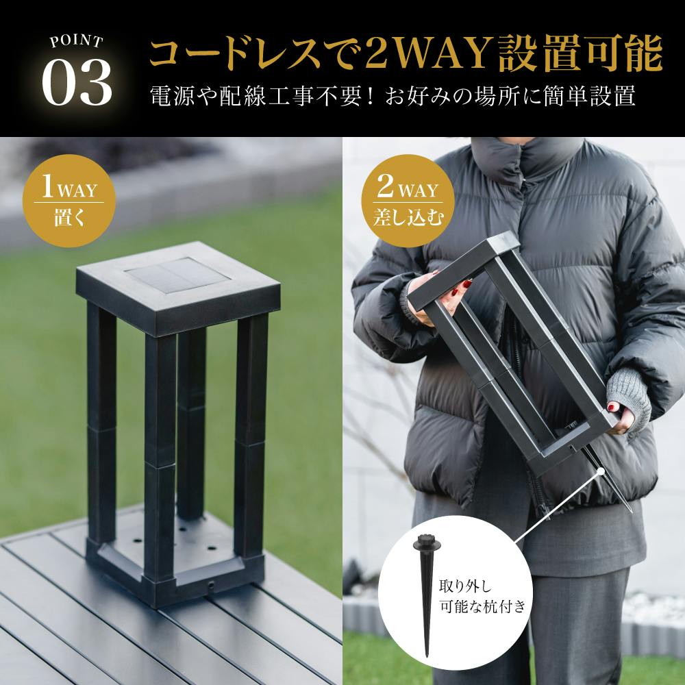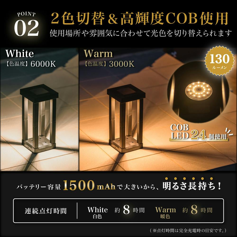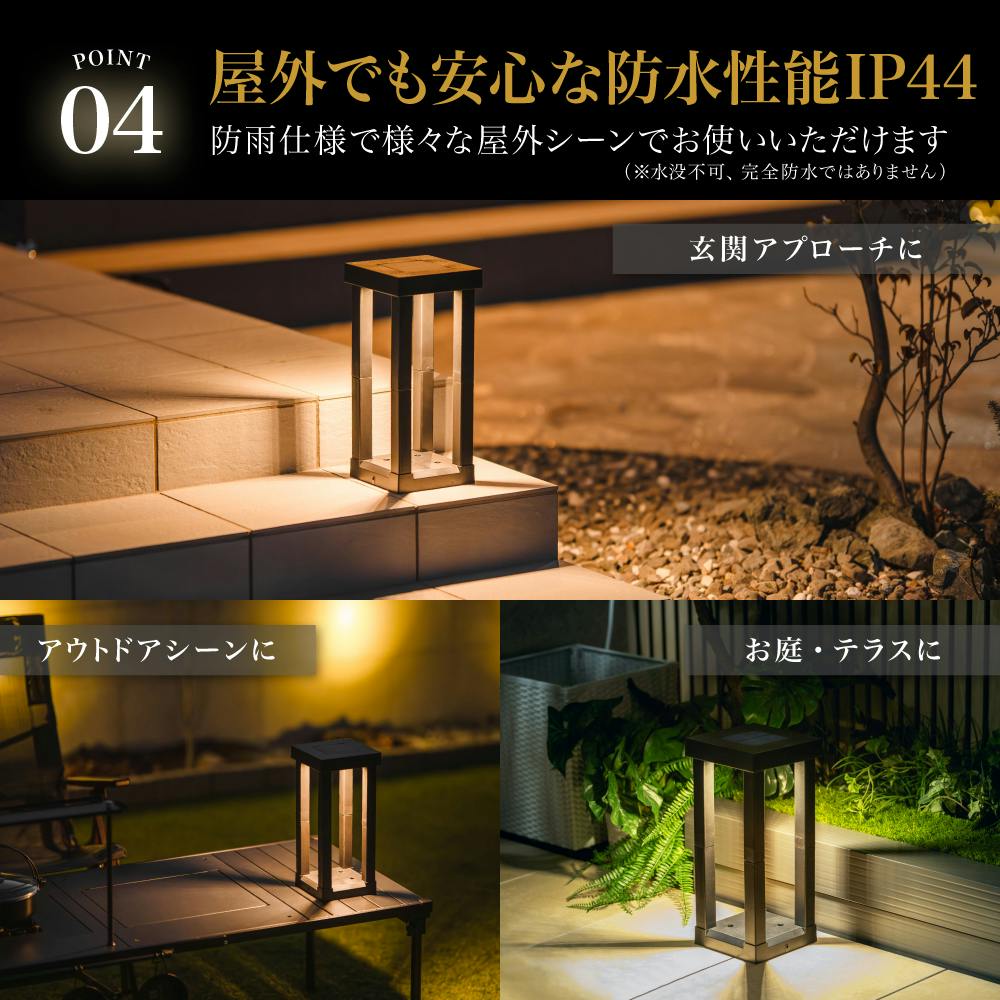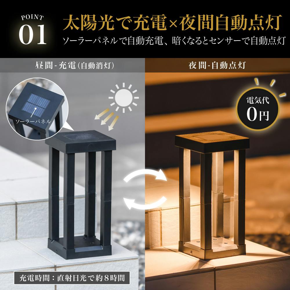 ・リチウムイオン電池は特性上、完全放電すると再充電ができなくなる場合がありますのでご注意ください。・季節や日照条件により、7~8日間充電が必要になる場合があります。・ソーラーパネルや電池の個体差により、同じ製品であっても点灯時間や明るさに違いがある場合があります。・保管する場合はスイッチを「OFF」にしてください。