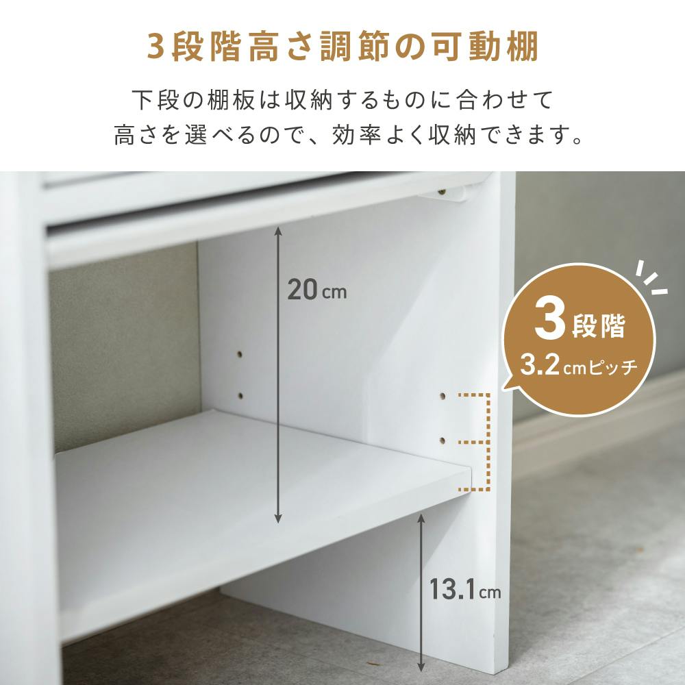 ・耐荷重:天板10kg、棚2段目2kg、可動棚5kg・熱い鍋・やかん・ガスコンロや家電などを、本製品の上に置かないでください。火災・変色・表面加工はがれ・割れなどの原因になります。・火のそばや直射日光の当たる場所での使用や保管は変形・劣化の原因となりますのでおやめください。・本製品を移動させる場合は、天板に載っているものや収納しているものを必ず取り除いてから移動してください。移動をする際は、周りに十分気を付け、落としたり、乱暴に扱わないようにしてください。