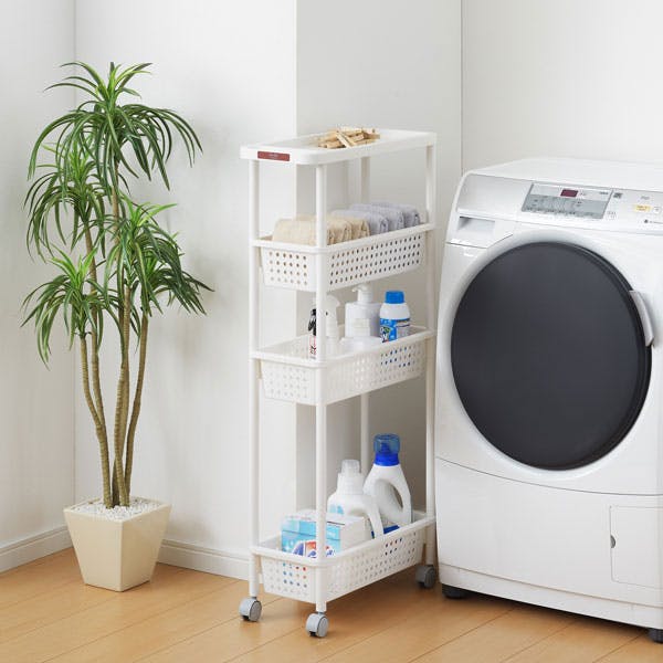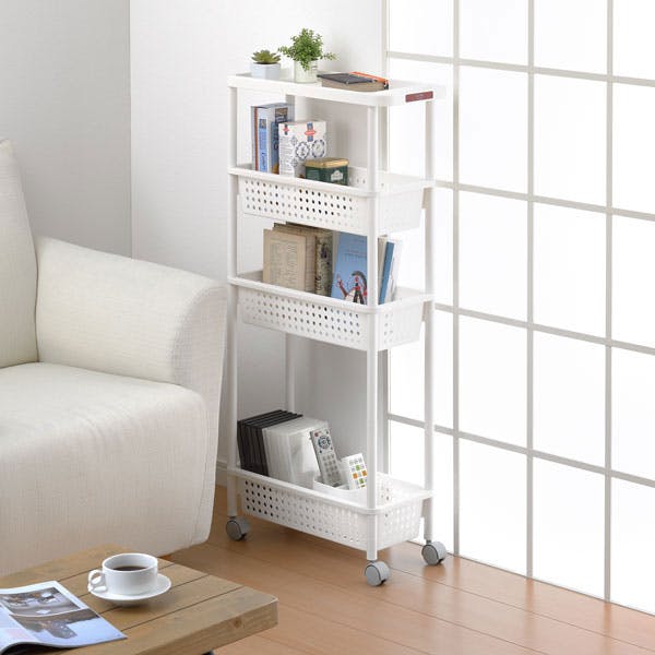 SANKA squ+ サンカ キッチンワゴン スリムワゴン (幅21cm) 4段 ホワイト 簡単組立 通気性の良い穴あきバスケット キャスター付き 日本製 (幅21.5×奥行48×高さ101cm) 隙間収納 スリムラック キッチン 洗面所 CG2-S4WH-1【別送品】