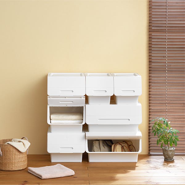 ■前面開閉式だから、積み重ねても下に入っているものが取り出せる■蓋がカパッと開いてそのまま固定できるから出し入れラクラク■5つのサイズを自由に組み合わせできる■別売りキャスターで移動ラクラク!■収納目安(約) ・トレーナー…6枚・Yシャツ…11枚・バスタオル…6枚