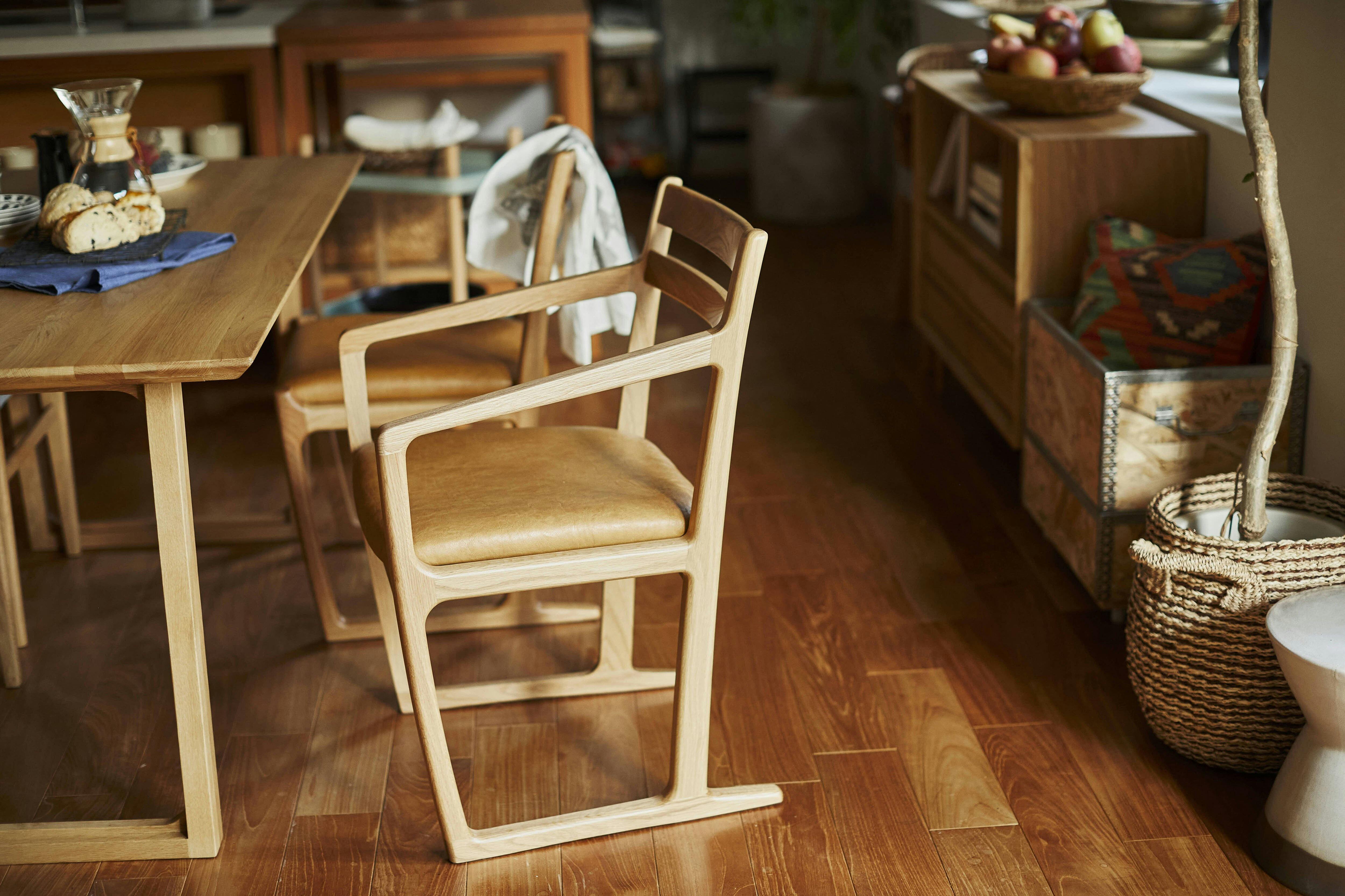 特徴的な形の木製フレームと異なる2種類の素材の組み合わせが温かで上質な空間を演出します。