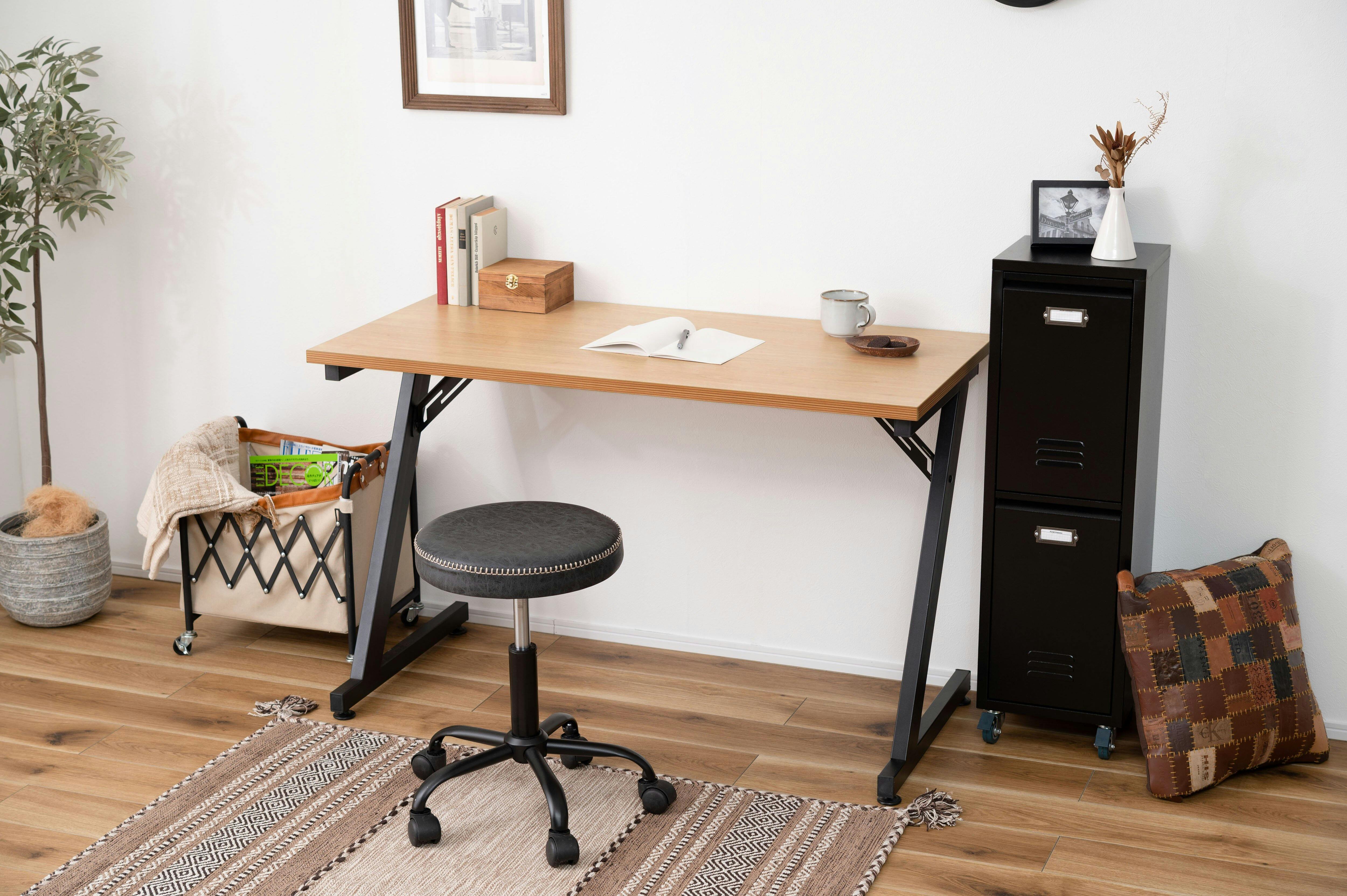 ●脚先にはガタつき防止用のアジャスター付き。●天板は木目調のメラミン化粧繊維板。メラミン化粧板は表面硬度が高く、対汚染性・耐摩耗性・耐熱性・耐水性に優れ、傷が付きにくくお手入れも簡単。毎日長時間使用するデスクに最適の材質。