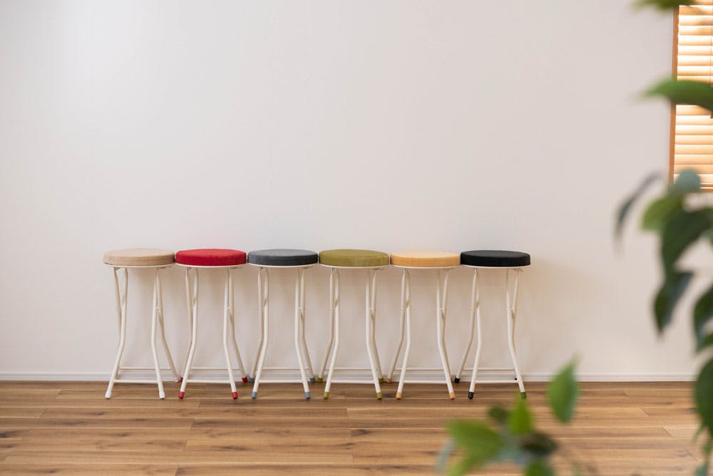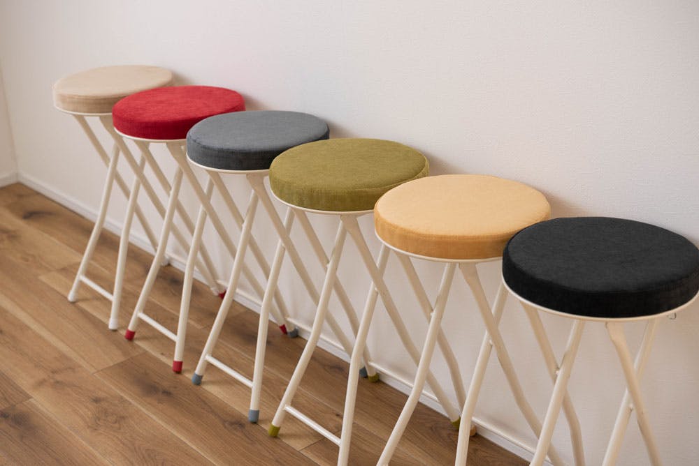 ●軽量なので持ち運びもラクラク。●折りたたみ式(フォールディング式)なので、隙間収納に最適。●ベロア生地のように細かく起毛した手触りの良い生地。●脚先キャップは座面の色と同色に揃えたデザイン。床への傷防止にもなり安心です。
