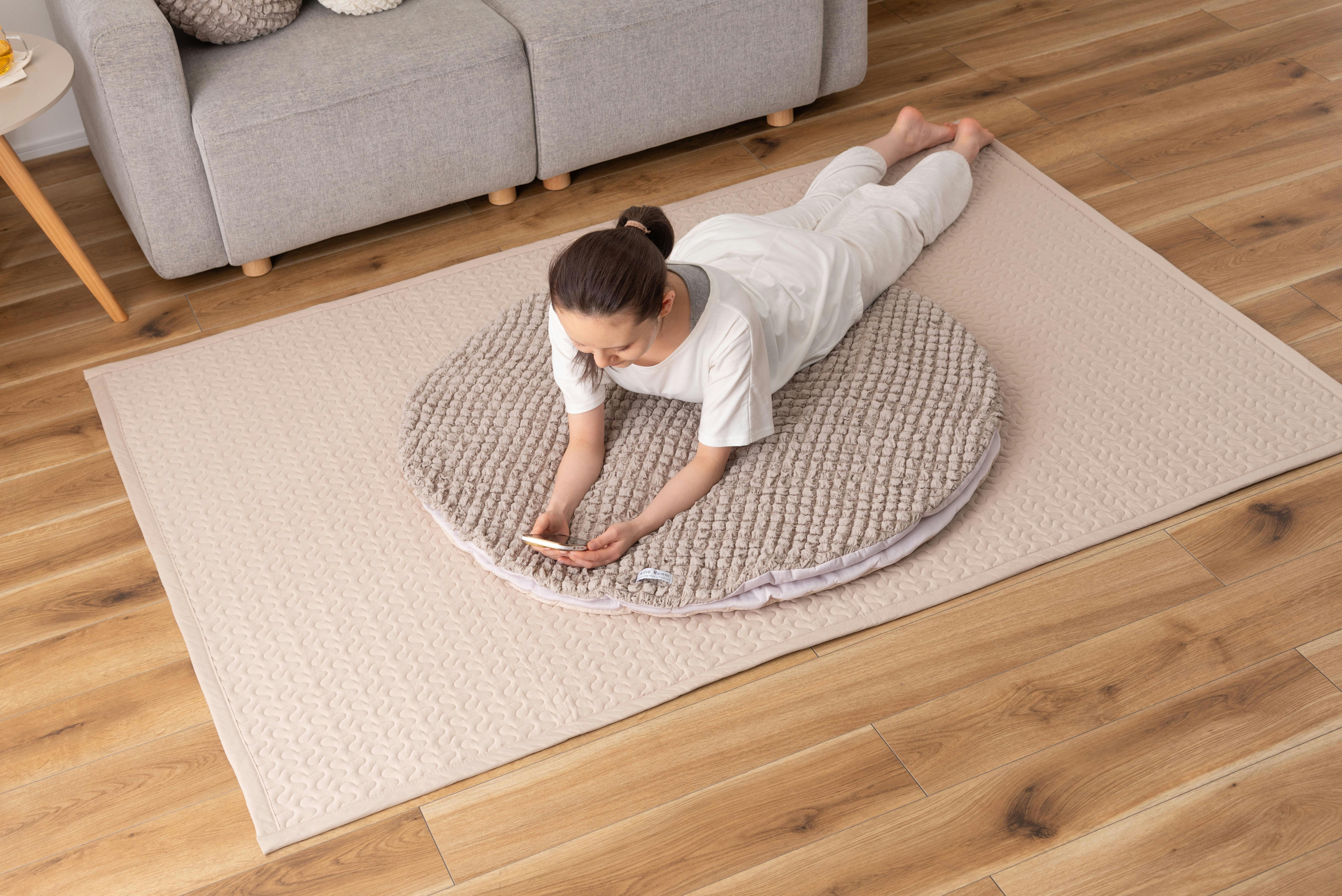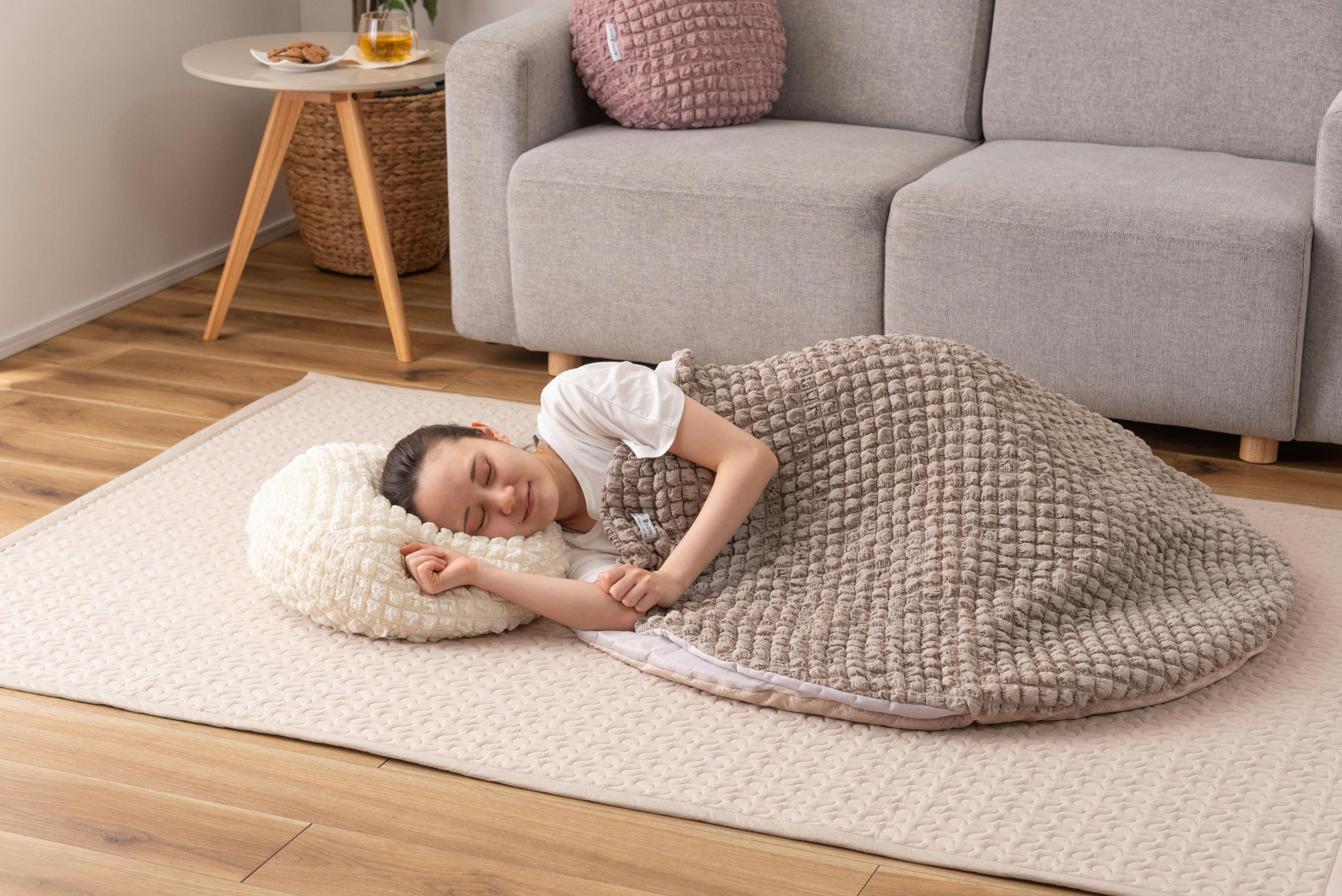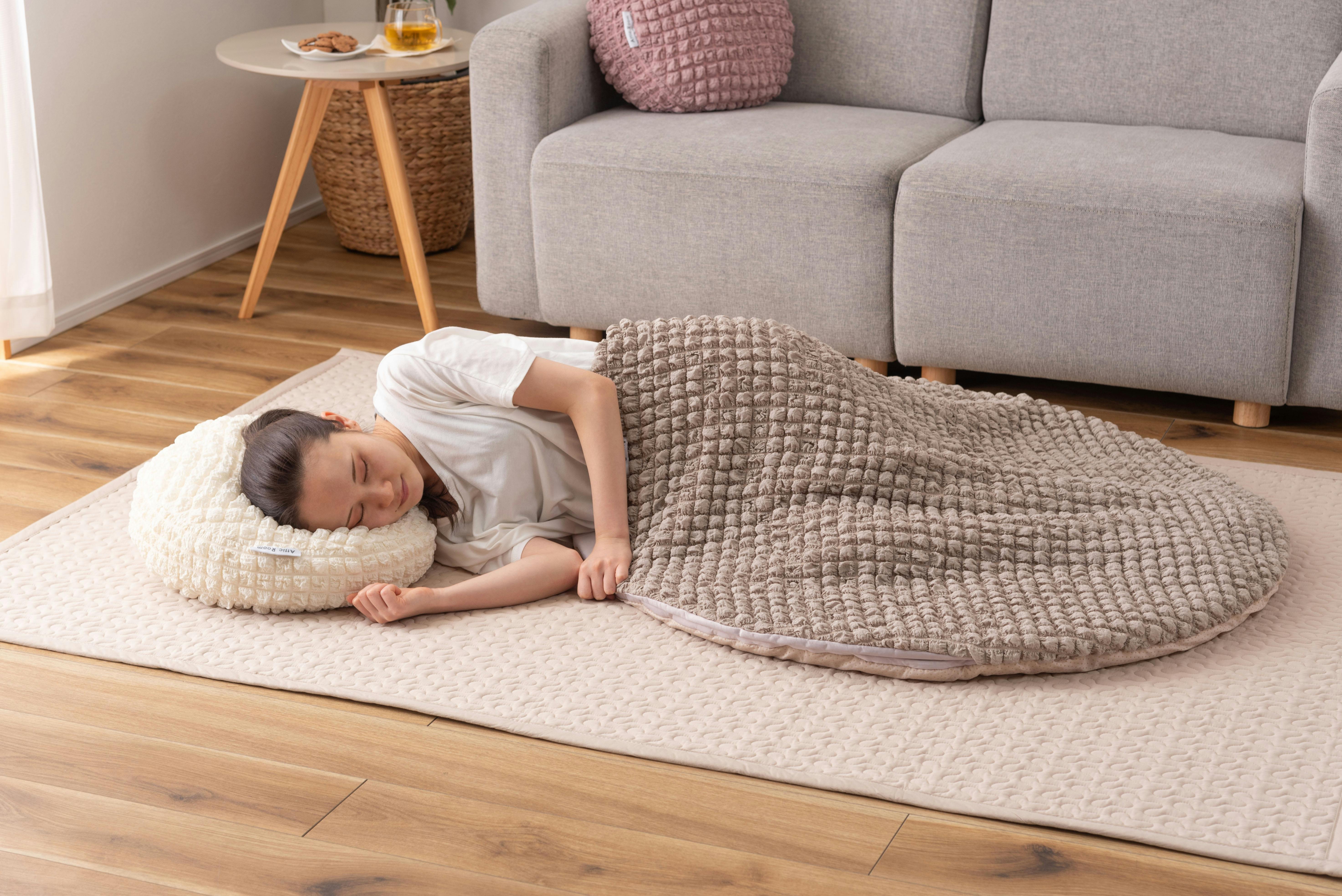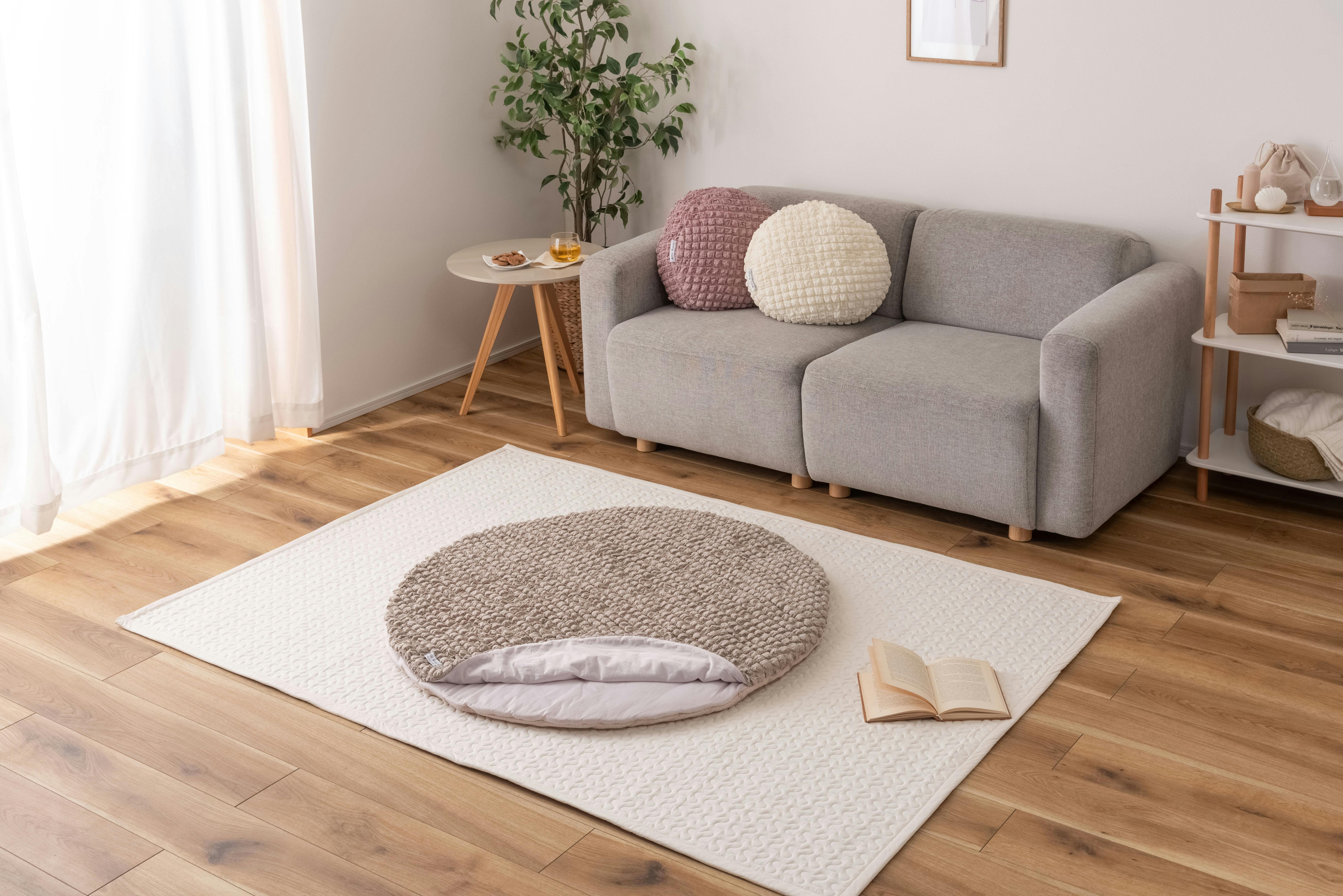 ●底部分はクッション性があるので、お昼寝タイムにも活躍●中に入って使うだけでなく、上に乗ってフロアクッションの様な使い方をするのもオススメ●底面はクッション性のあるウレタンを使用●表面のポップコーン生地、中面の生地のどちらも接触冷感仕様●裏面には滑り止めが施されているので、フローリングの上などで使う際はズレにくく快適●人気のくすみカラーを採用