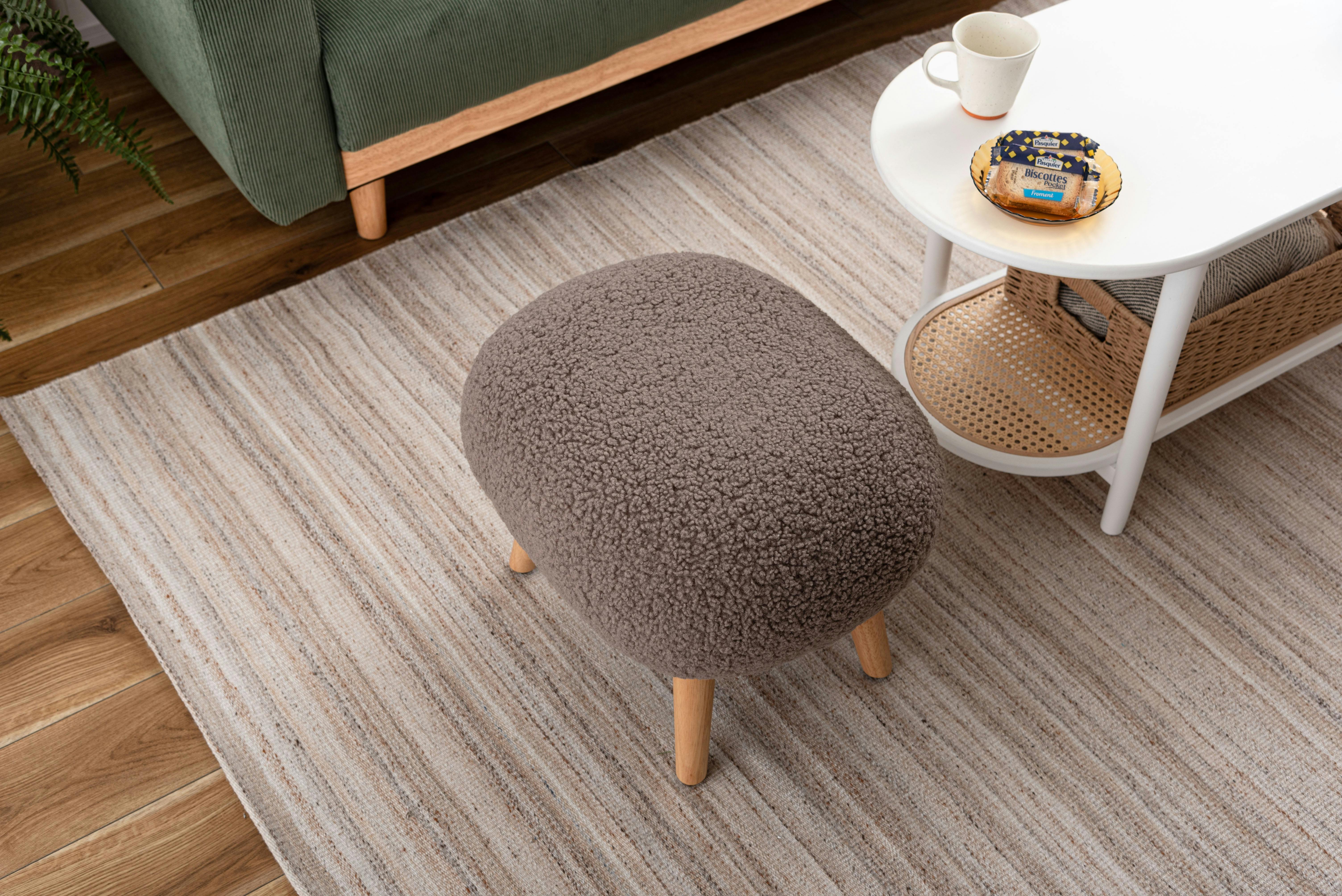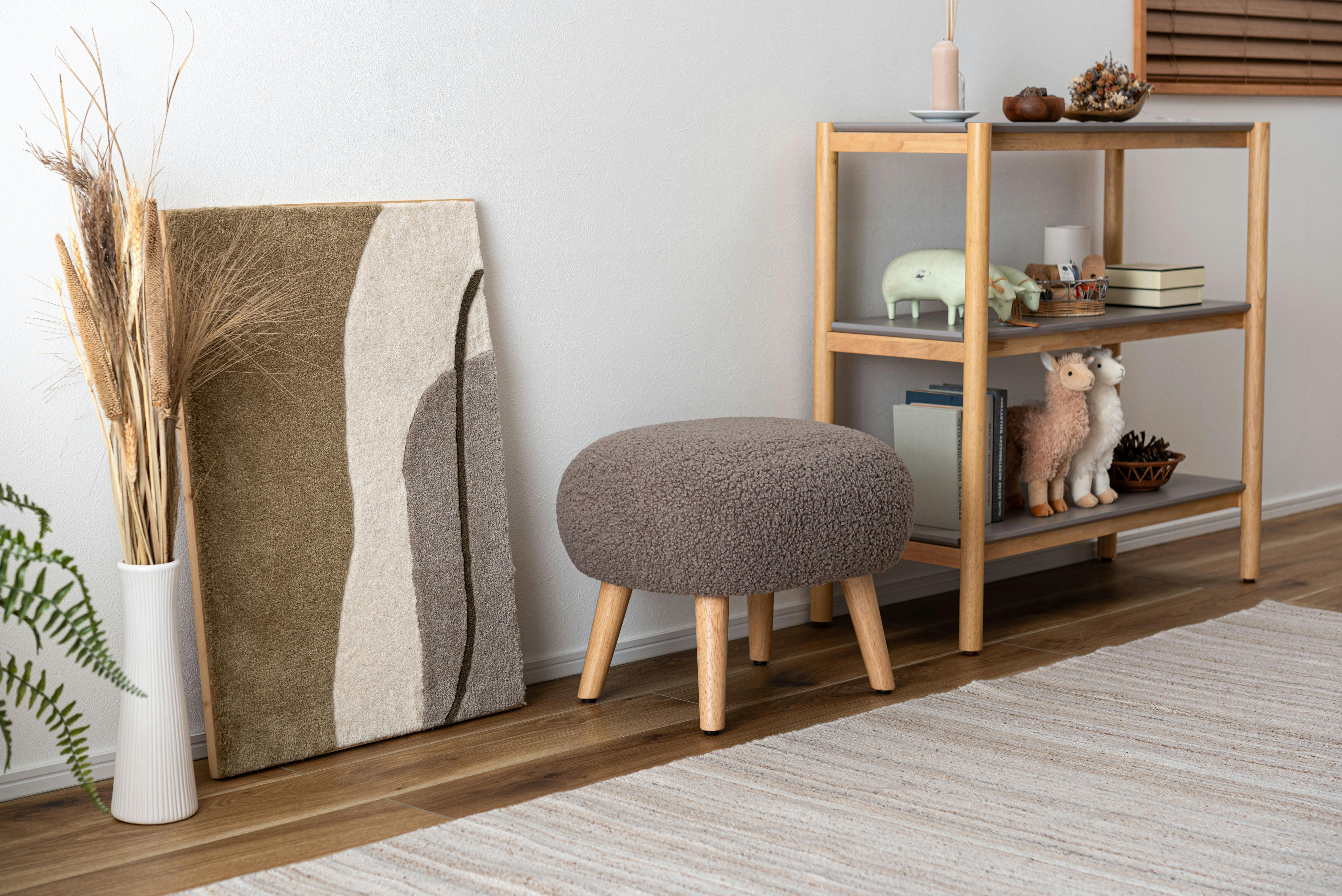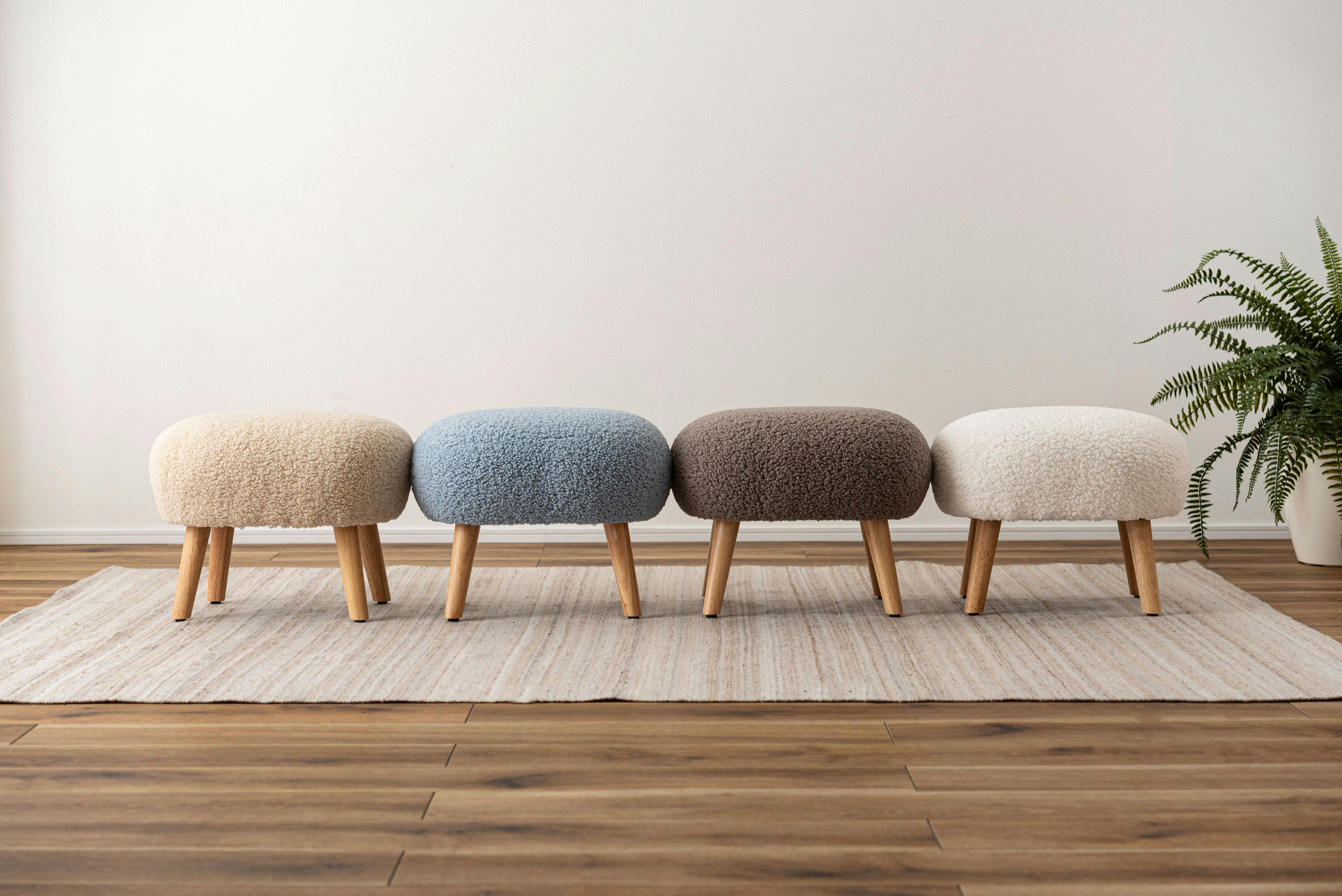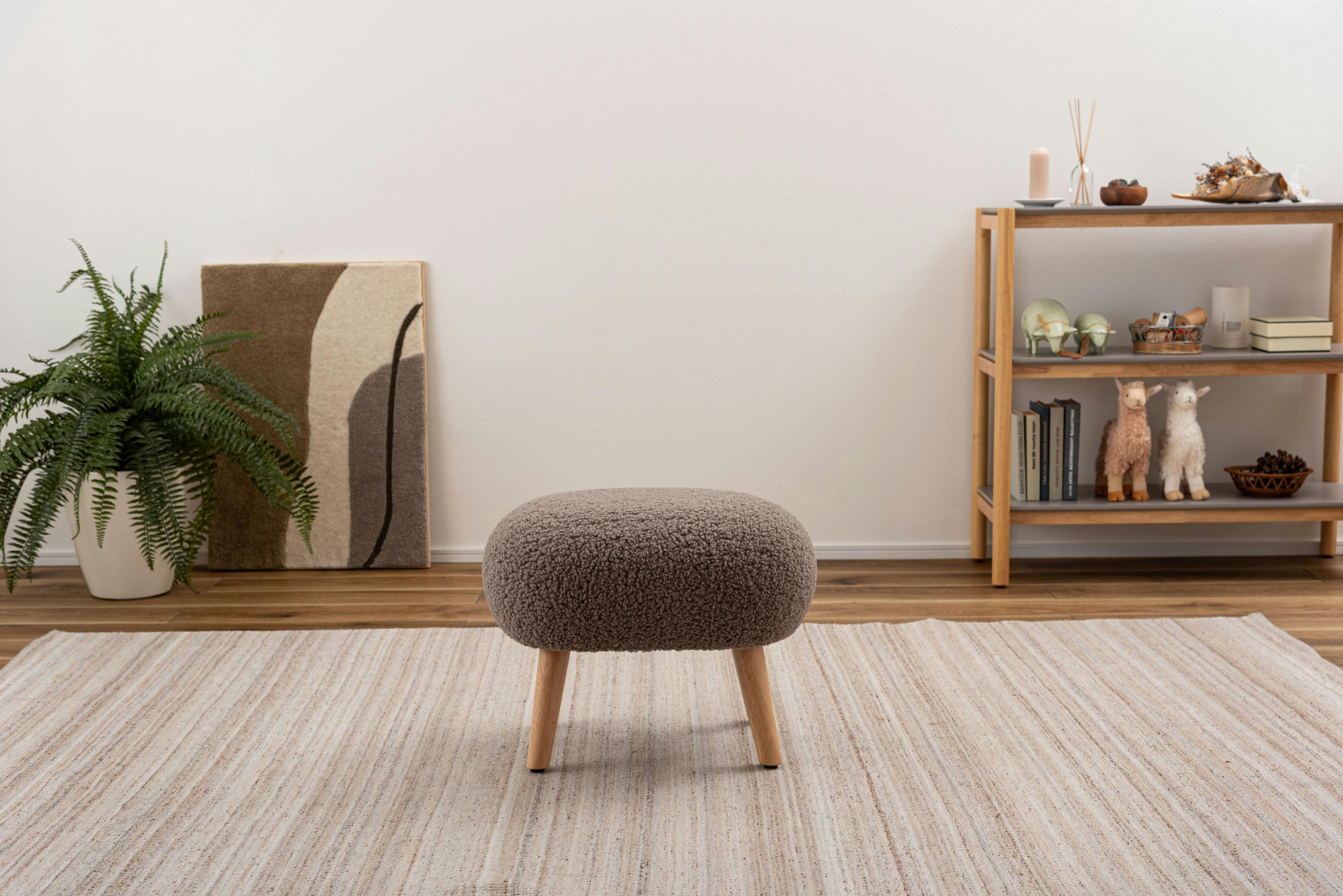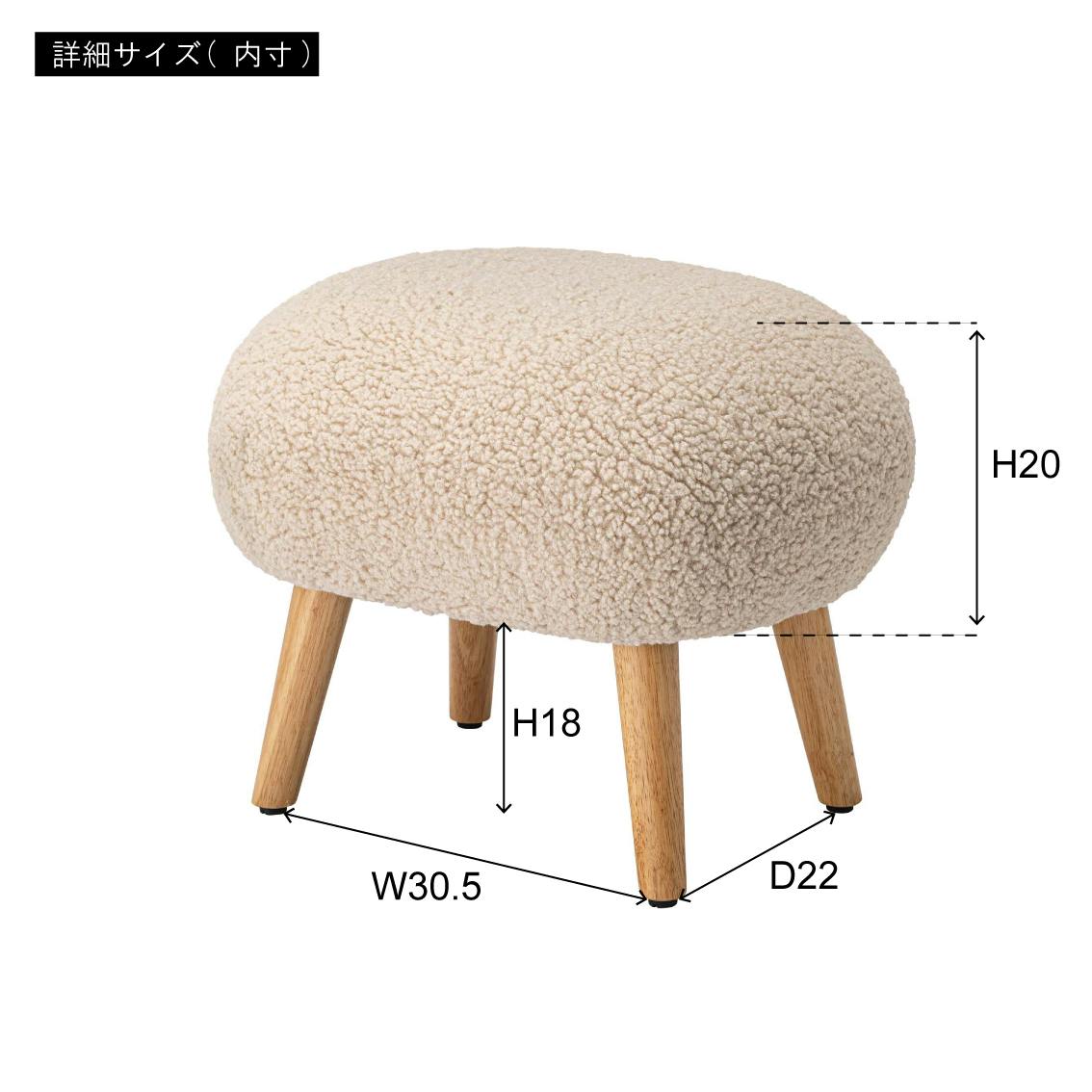 ●場所を取らずリラックスして座れる少し低めの座面●ずっと触っていたくなる、もこもことした柔らかい感触のブークレ生地を使用●スツールとしてだけでなく、ソファと組み合わせてオットマンとしても●脚裏にアジャスターが付いているので、座る際のガタつきを調整
