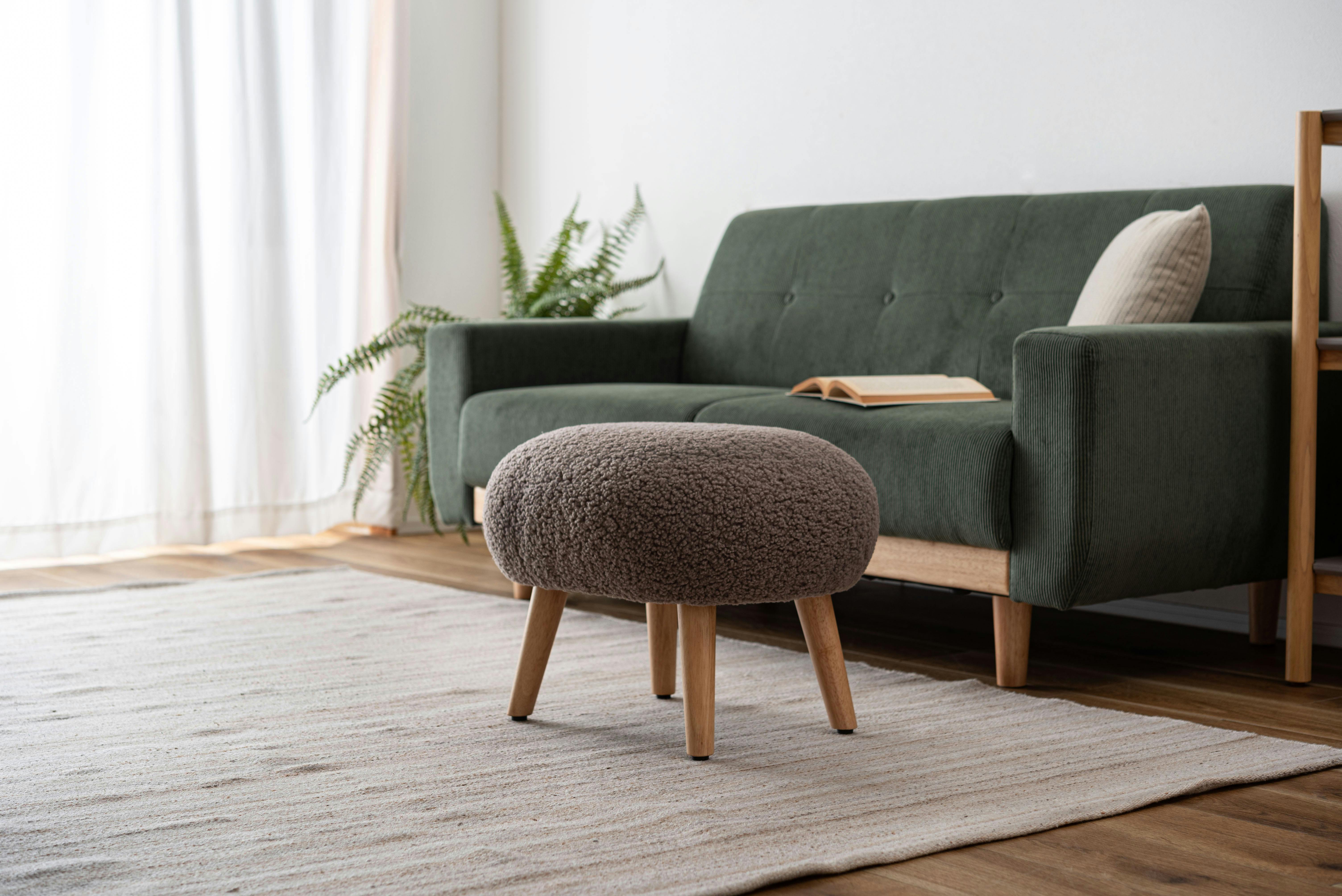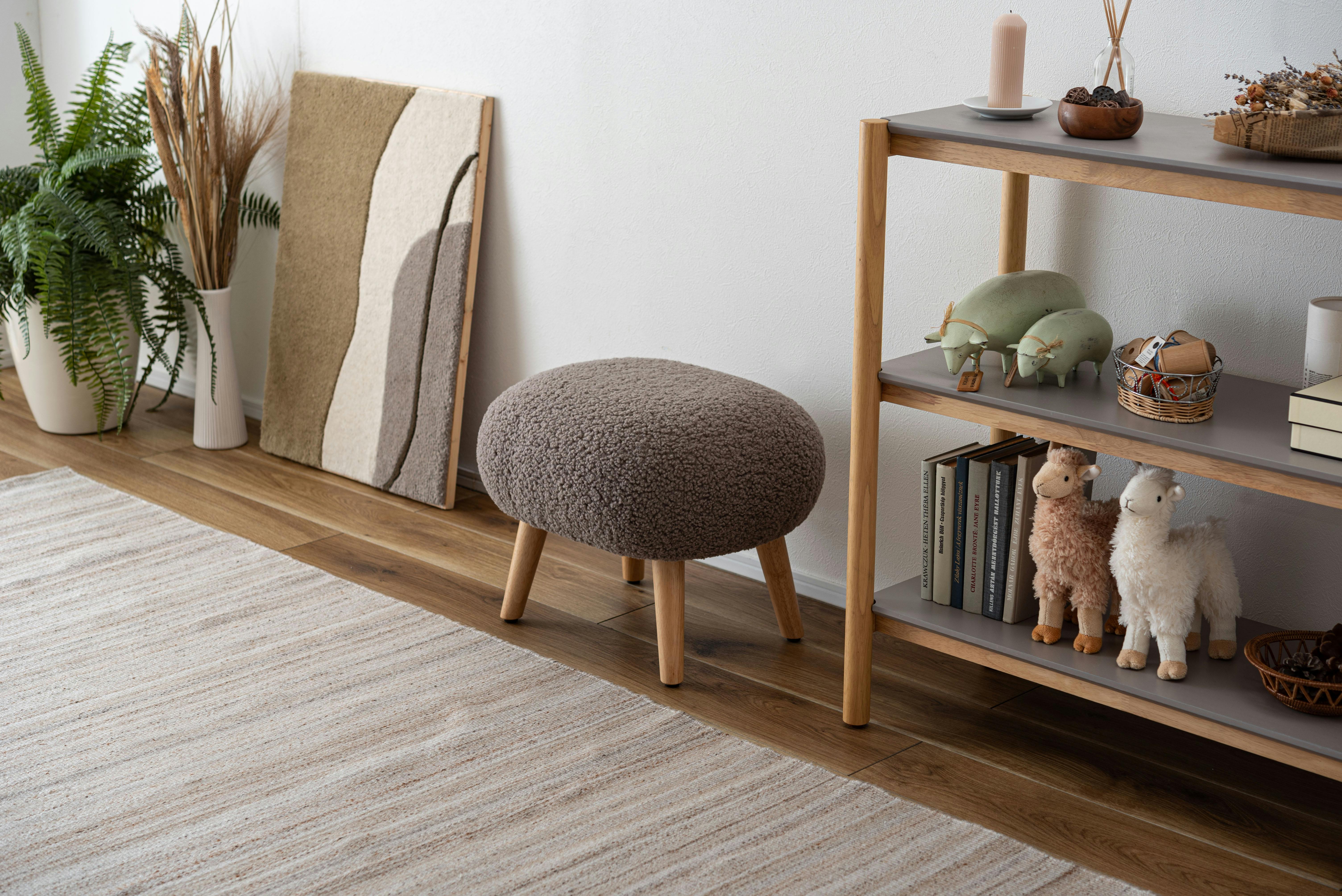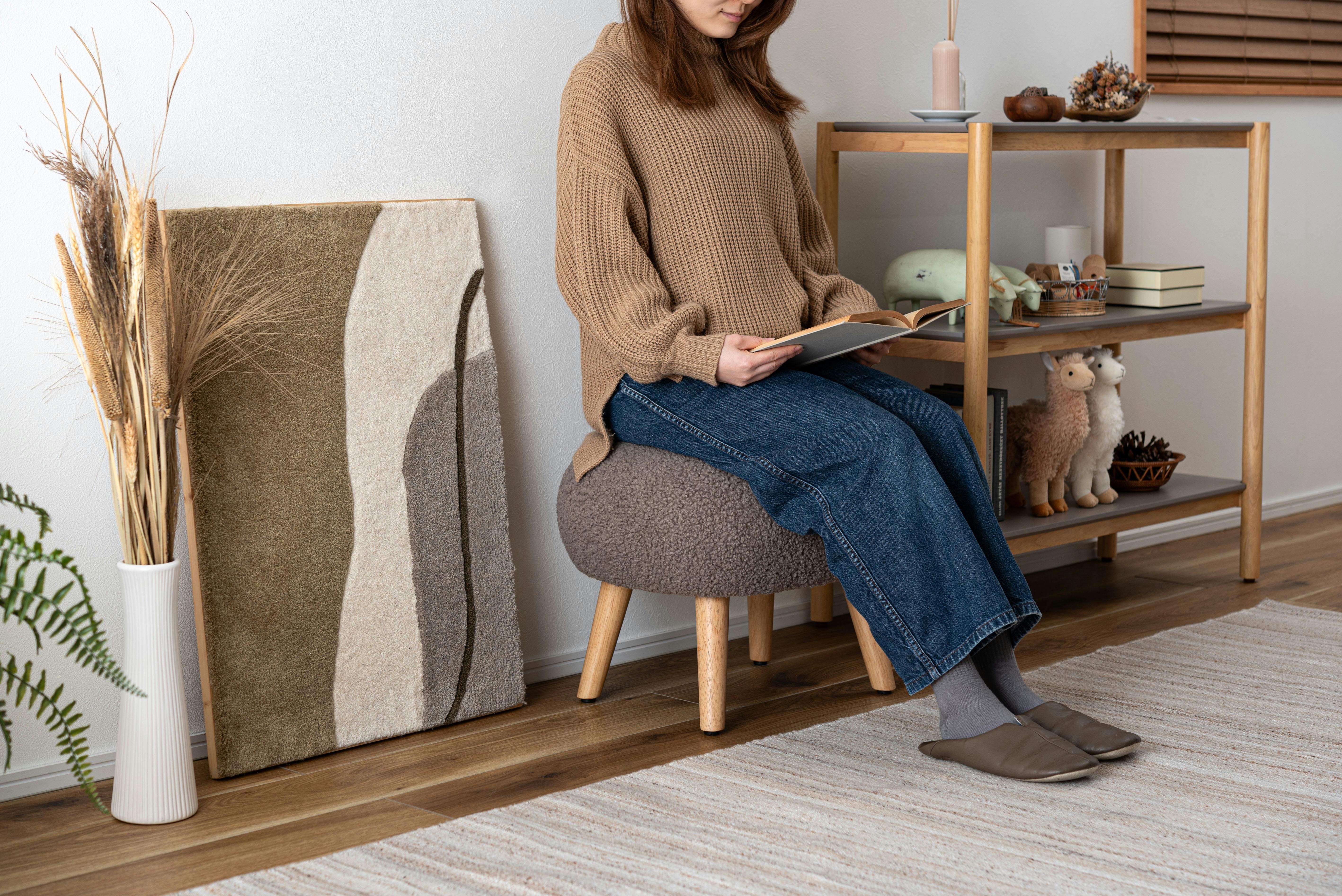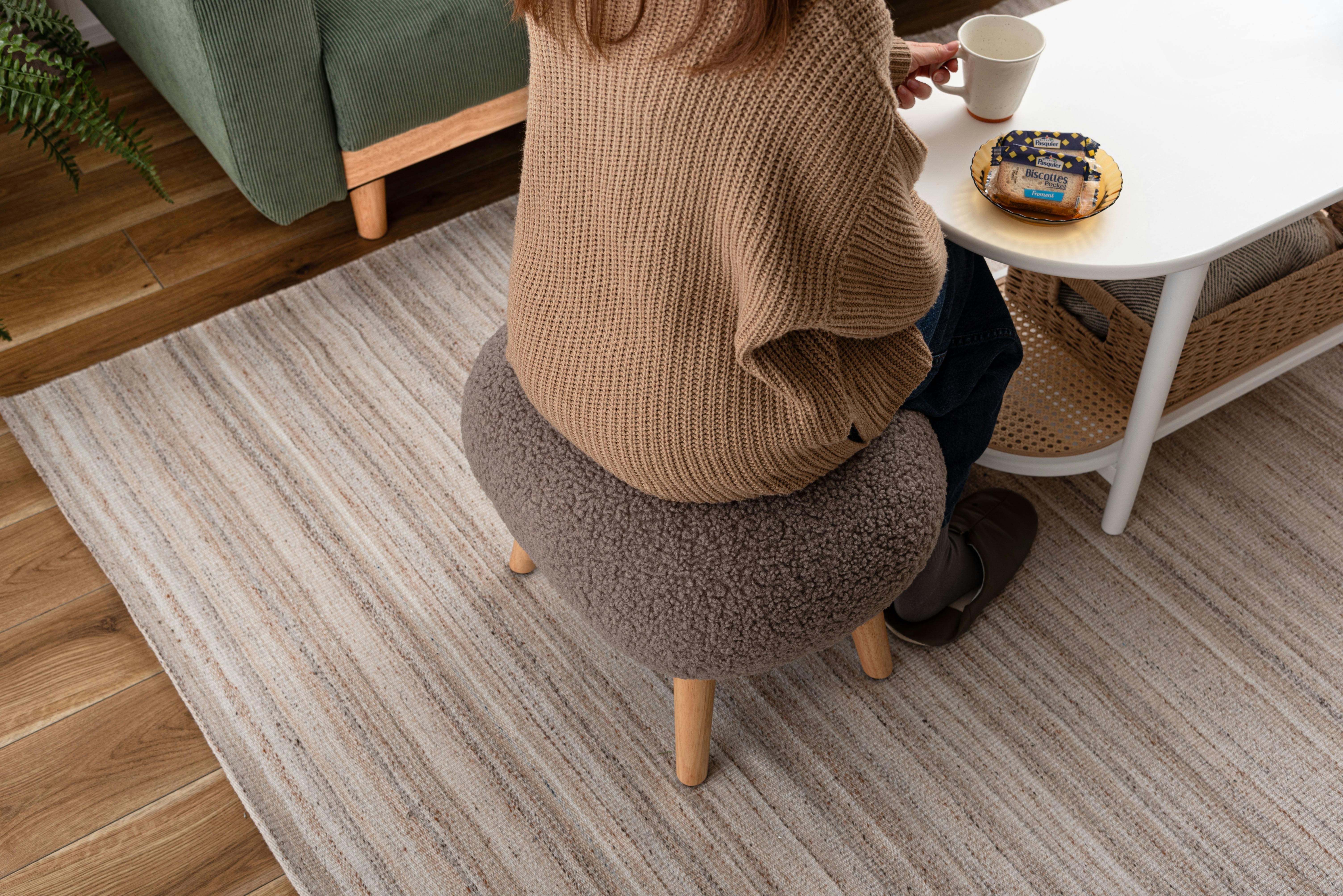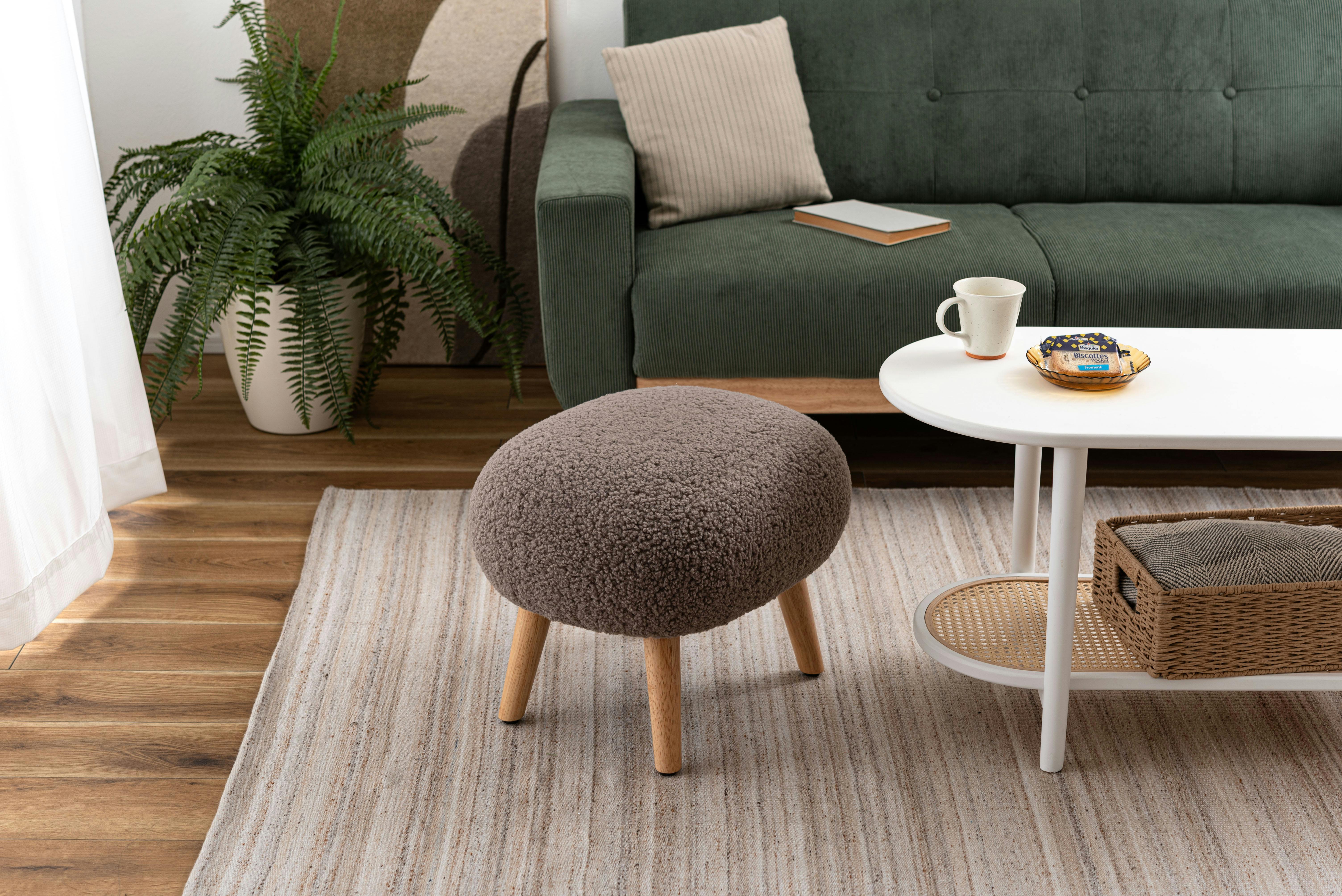 ●場所を取らずリラックスして座れる少し低めの座面●ずっと触っていたくなる、もこもことした柔らかい感触のブークレ生地を使用●スツールとしてだけでなく、ソファと組み合わせてオットマンとしても●脚裏にアジャスターが付いているので、座る際のガタつきを調整