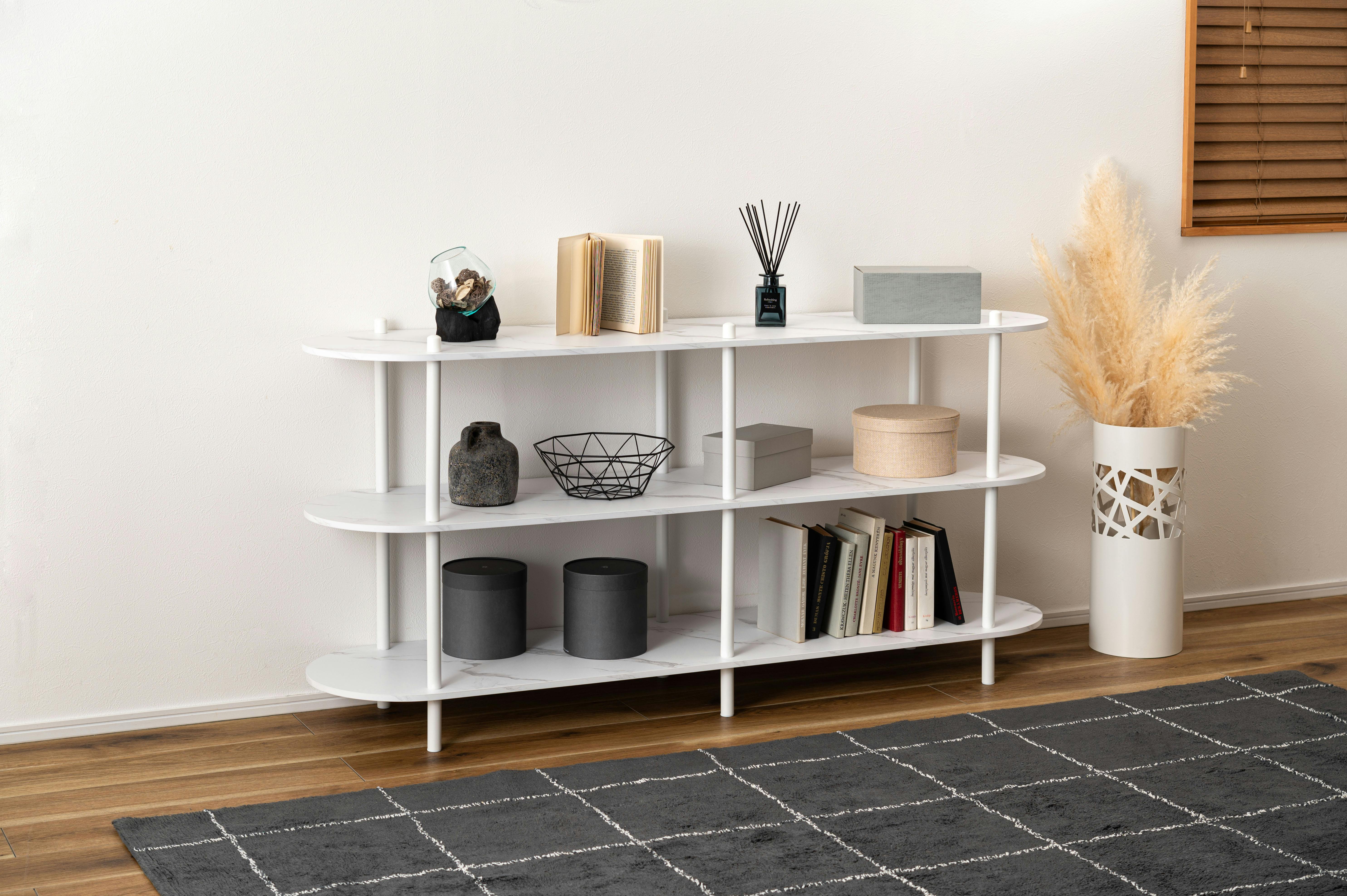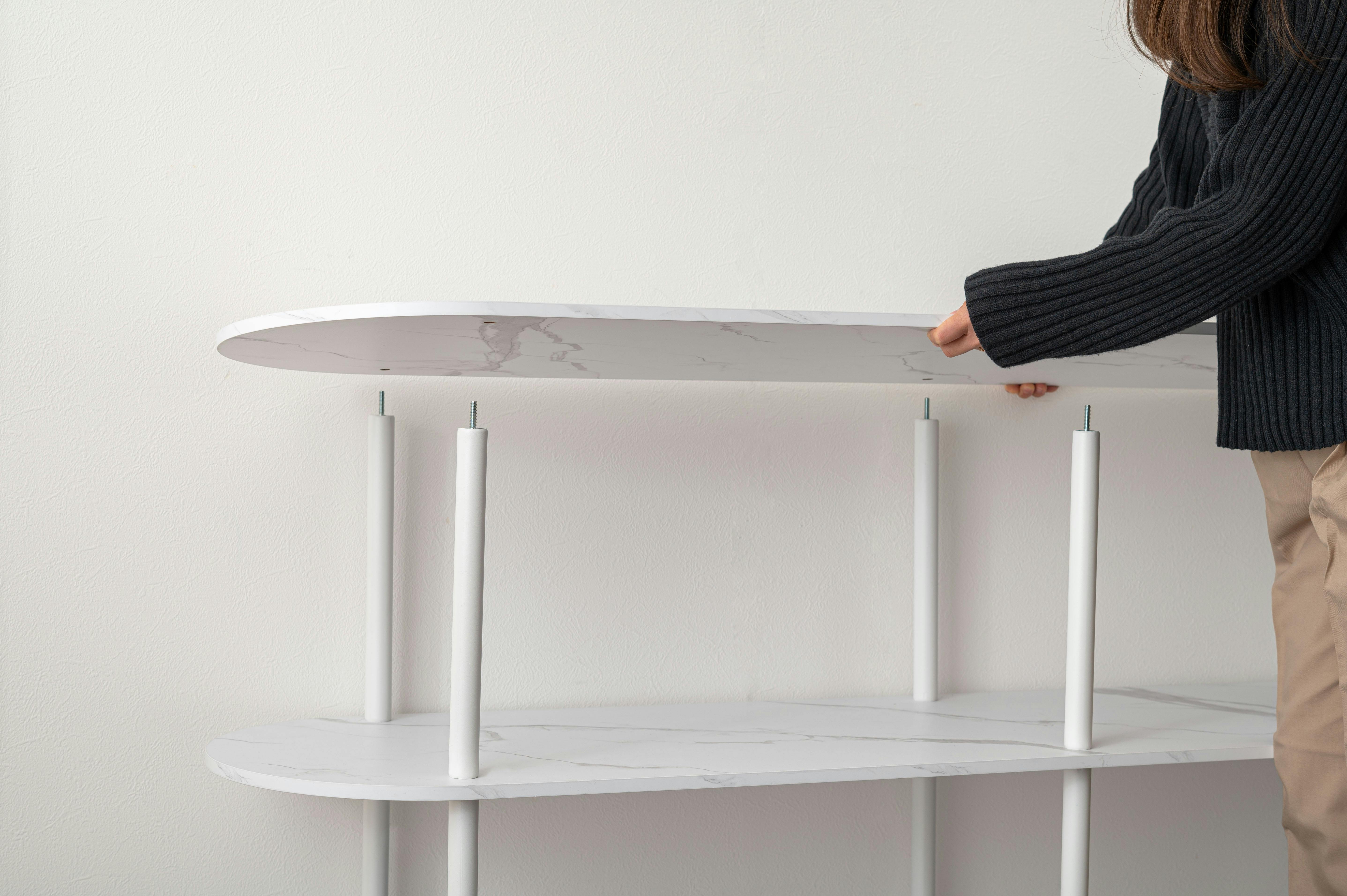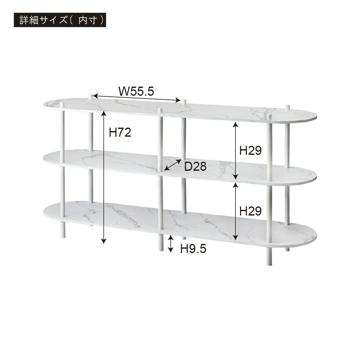 Room Essence オープンラック3段 W155×D38×H76 ホワイト ねじこみ式 収納棚 ディスプレイラック 大理石調 石目調 シック モダン 楕円形 リビング 見せる収納 スチール脚 PT-564WH【別送品】