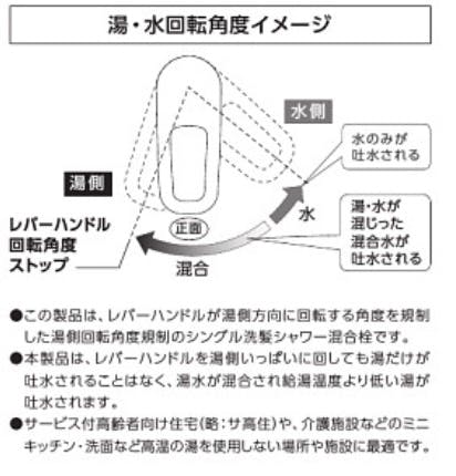 ●湯側のハンドル回転角度を規制し、高温の「湯だけ」が出ないようにした構造の水栓です●シャワーヘッドが引き出せるので洗髪にも便利です●きめの細かい2種類の穴径を採用し、中抜け感がなく、肌当たりがよく水はねも少ない快適なシャワーです。シャワーヘッドが収まった状態で左・右約60°(片側30°)首振りができます●高さが一段階リフトアップします。スタンド回転時はクリック感があります●