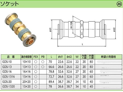 適合樹脂管:13×16、PEX:◯、内箱入数:20、外箱入数:60